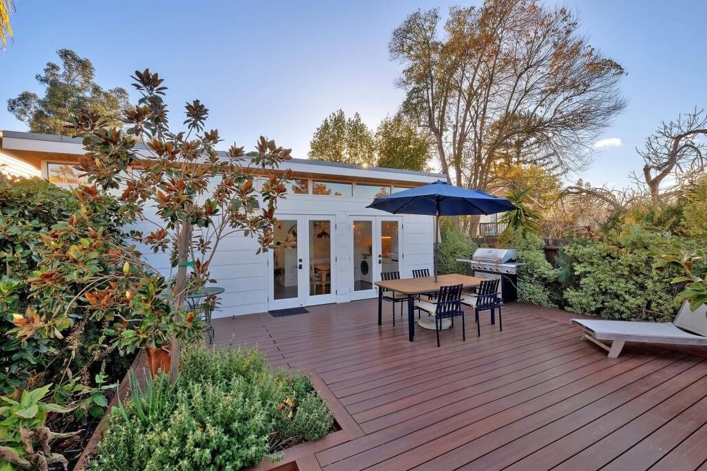 Once inside, there’s a kitchenette, high ceilings with clerestory windows, full bathroom with walk-in shower and heated floors, and a wall-mounted Toto toilet. Double French doors open to the large deck for a seamless indoor / outdoor living experience.