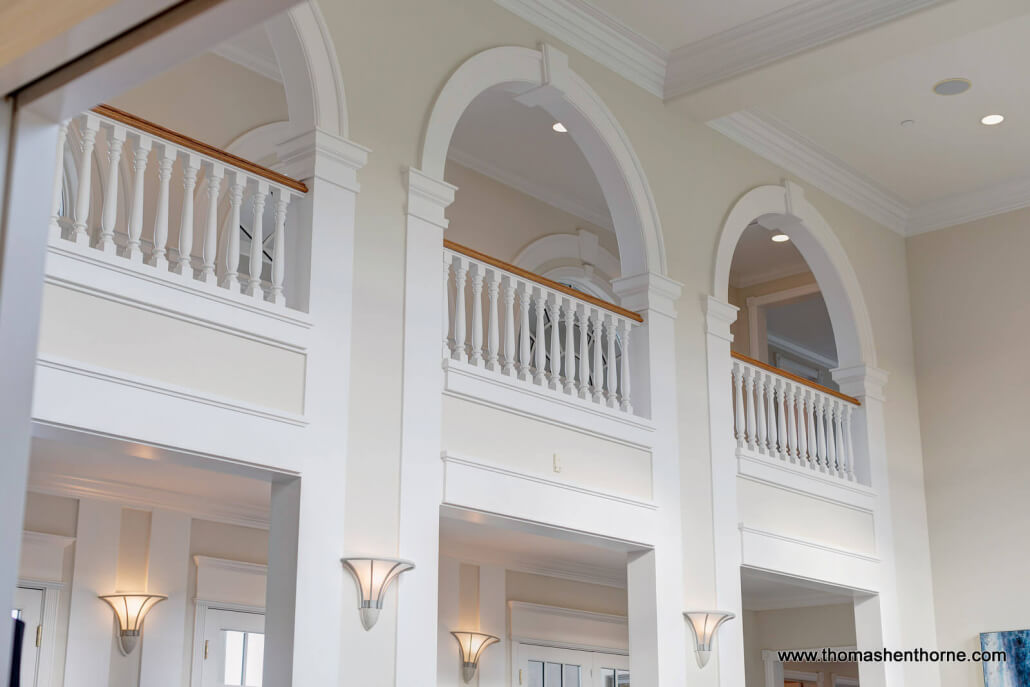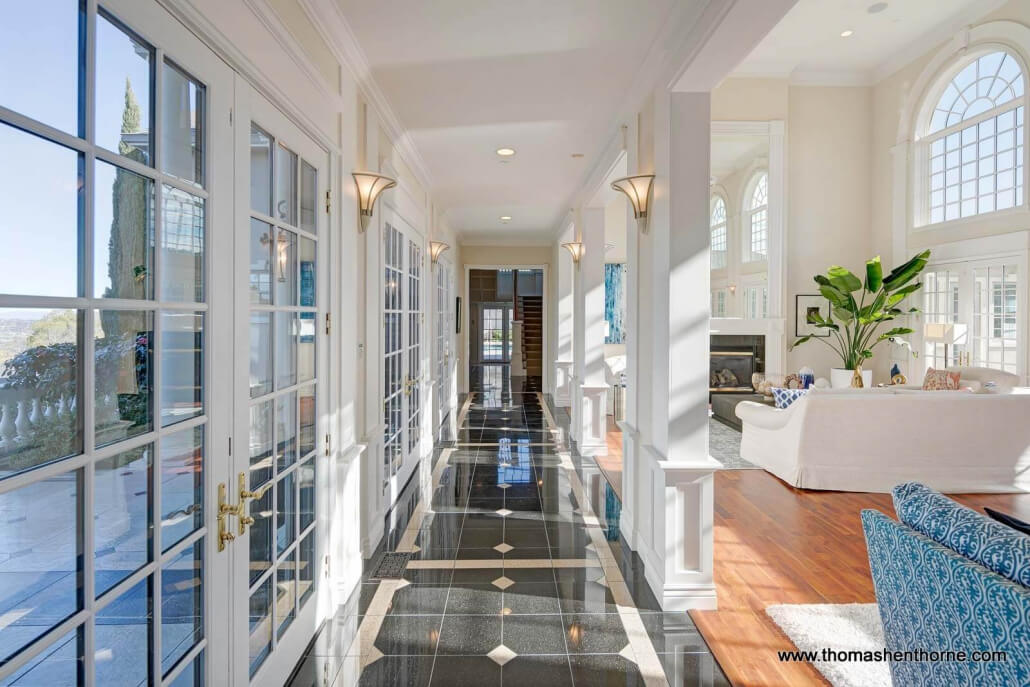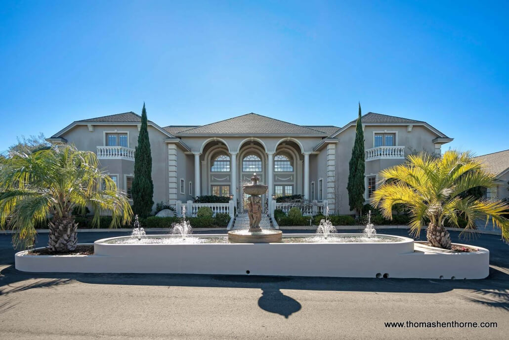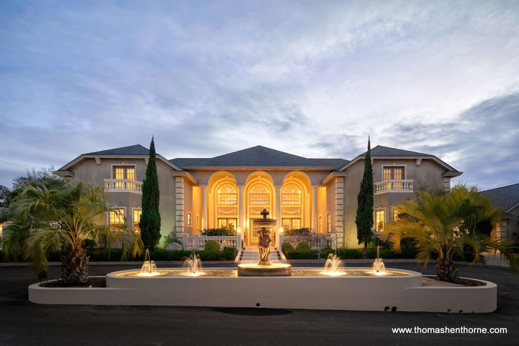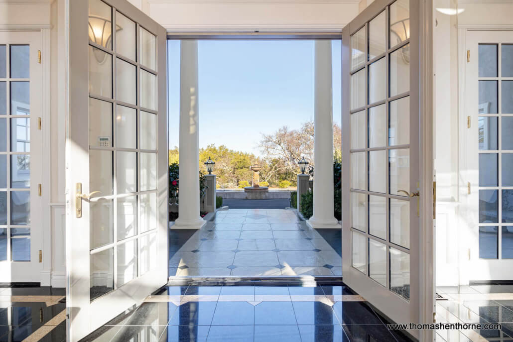 The stunning Italian Renaissance architecture is on full display as guests approach this grand estate via the long private drive. This impressive Palladian entry features triple columned arches that frame 3 sets of French entry doors with arched windows above. A stunning, custom fountain inspired by Antonio Canova’s Neoclassical sculpture “Three Graces” welcomes guests as they arrive. The stately foyer features patterned granite floors and beautiful, custom woodwork and opens up to the home’s sun-filled great room.