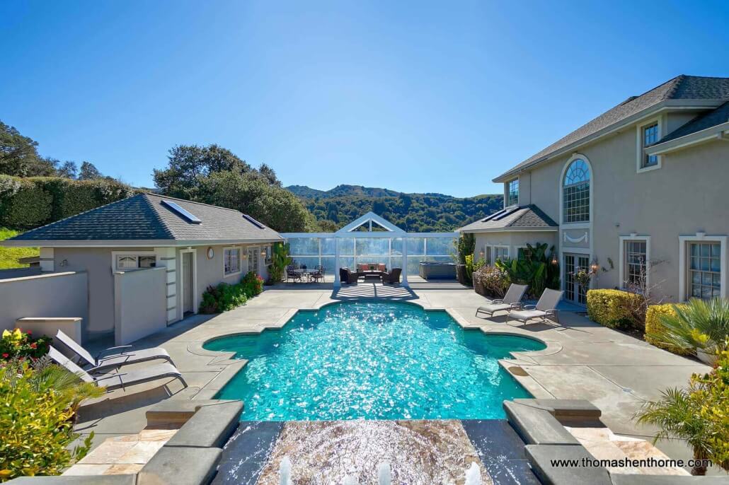 The home’s custom-designed salt water pool is reminiscent of a boutique resort with a 4,000 sq ft pool patio, elevated spa with 360-degree views and waterfall.