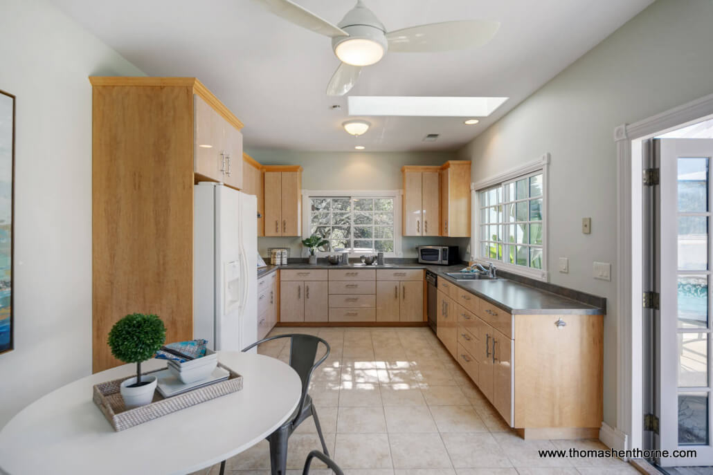 The private pool casita/guest house is located across from the main house on the opposite side of the pool. This separate guest house features tile floors, a full kitchen with a pass-thru window to the outdoor BBQ area, a full bath and a living/dining area.