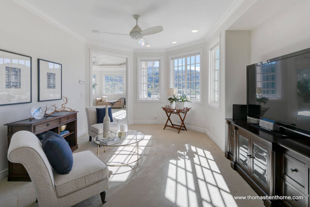 The spacious family room features a Dolby 7.2 home theater system with a built-in 65” 4K TV and adjacent equipment cabinet. The family room enjoys panoramic views and opens out to the entertaining patio.