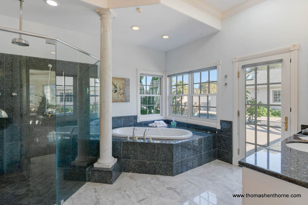 The master bath features an oversized jetted tub, granite and glass shower for two, separate vanities and a toilet room.