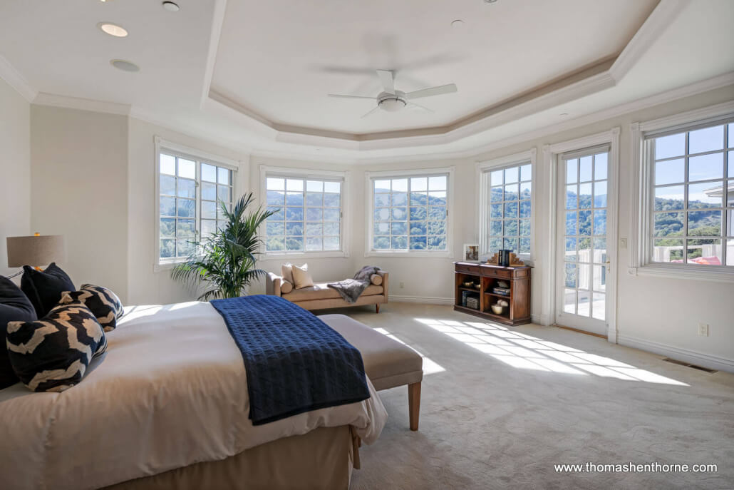 The master suite enjoys panoramic views, private access to the pool, spa and hot tub as well as the entertaining patio off the living room.