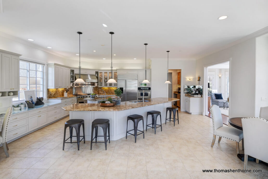 The kitchen is connected to a large butler’s pantry that leads to the formal dining room and features granite counters, custom cabinetry, a full-size sink, a second dishwasher and a service powder room.