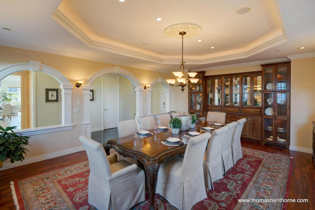 Designed for entertaining, the expansive formal dining room offers an elegant dining experience for 16+ guests. This lovely room features a beautiful arched entry, hand-laid hardwood floors, custom-built cherry and glass cabinetry, coffered ceiling and custom lighting for creating the perfect ambiance. Ideal for formal banquets or large family gatherings, the dining room is conveniently located across from the butler’s pantry allowing for easy service.