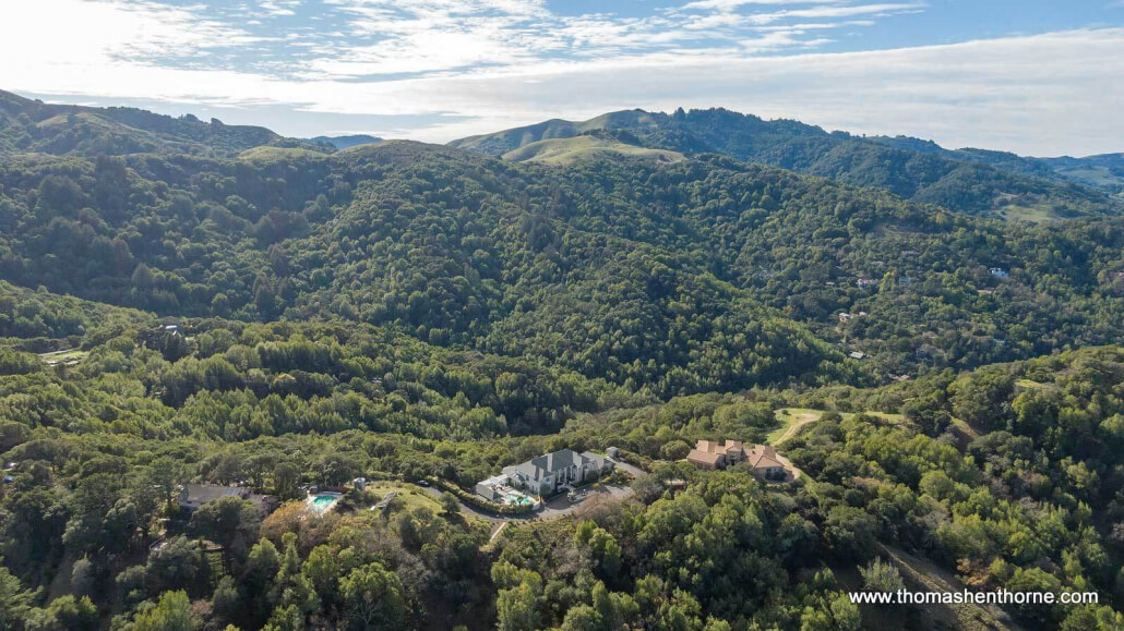 1100 Cabro Ridge, Novato — This magnificent private ridgetop estate boasts captivating 360-degree views of the bay and surrounding hills from 500 feet above sea level. Located just 20 miles north of the Golden Gate Bridge, 1100 Cabro Ridge is ideally situated at the end of a private drive on 11+ pristine acres. The property is surrounded by permanent open space on two sides ensuring a level of privacy and tranquility rarely found.