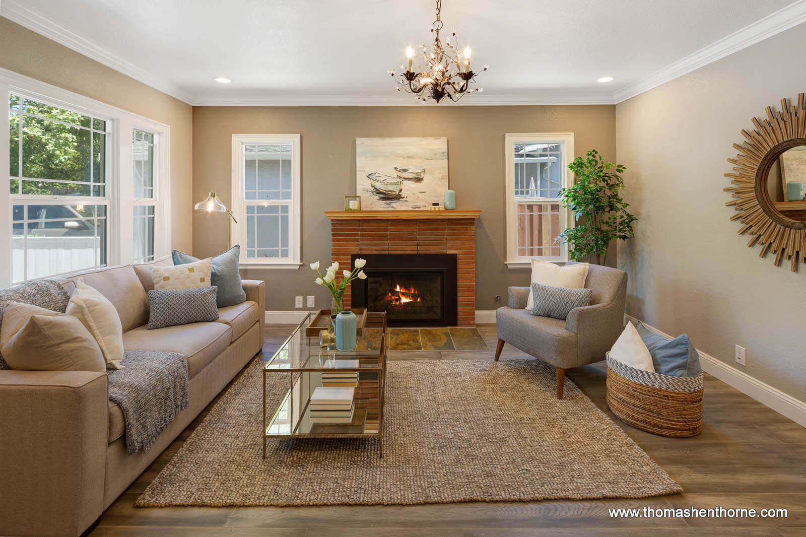 The living room is anchored by an inviting fireplace, wonderful for those chilly northern California evenings. The well-proportioned room is beautifully remodeled with wide-plank engineered flooring, recessed lighting, and new windows & doors.