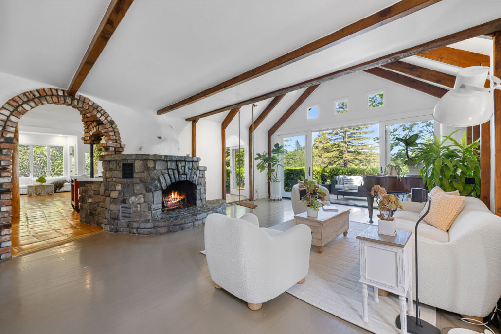 The home’s expansive living room exudes timeless character and warmth. A striking stone fireplace anchors the living room, where vaulted, exposed-beam ceilings and clerestory windows enhance the storybook charm. A wall of glass opens directly onto an expansive entertaining deck with stunning views creating seamless indoor-outdoor connection. Painted wood floors and handcrafted details throughout add texture and character, reflecting the home’s storybook appeal and European charm.