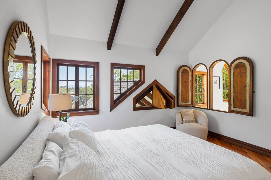 This expansive upstairs primary bedroom retreat offers a serene and private sanctuary. Custom-designed windows frame tranquil garden views, filling the room with natural light and enhancing the wide-plank wood floors. The room’s high ceilings and open-beam architecture enhance its airy, spacious feel. Natural light floods the space, highlighting the rich wood flooring and creating a warm, inviting ambiance. Designed for relaxation and comfort, this bedroom seamlessly blends classic charm with modern elegance.