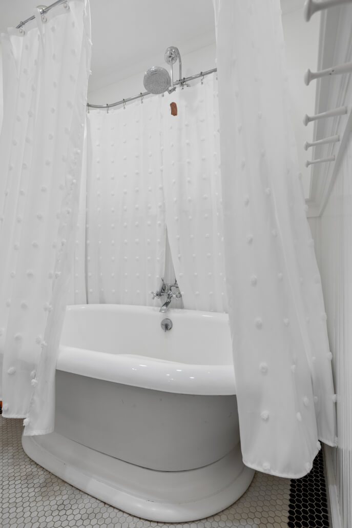 Located on the main level, two comfortable bedrooms feature hardwood floors and garden-view windows that bring in natural light and greenery. These bedrooms share a beautifully appointed full bath, showcasing custom tile work and a large soaking tub with a shower-over-tub configuration.