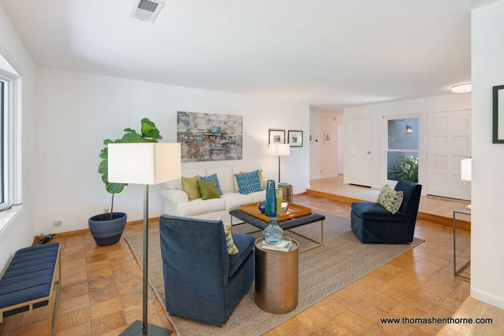 The large living room overlooks the back yard and adjoins the dining room. The living room features a parquet wood floor.
