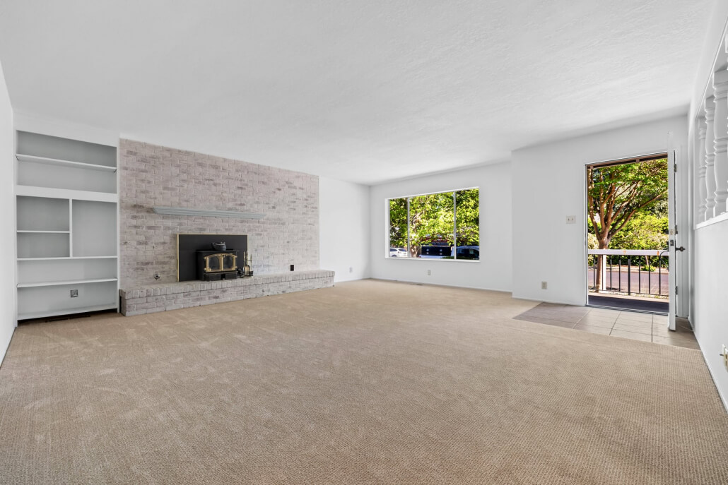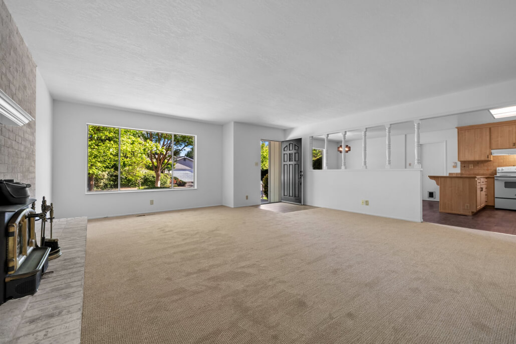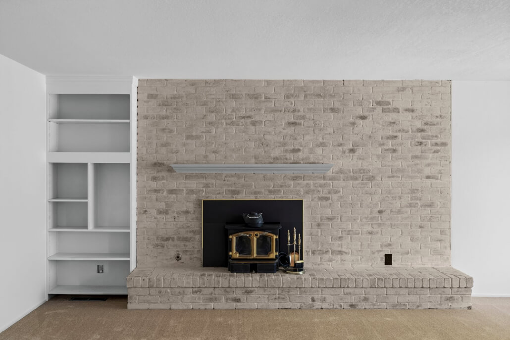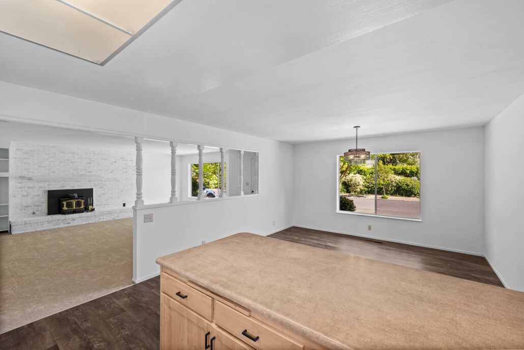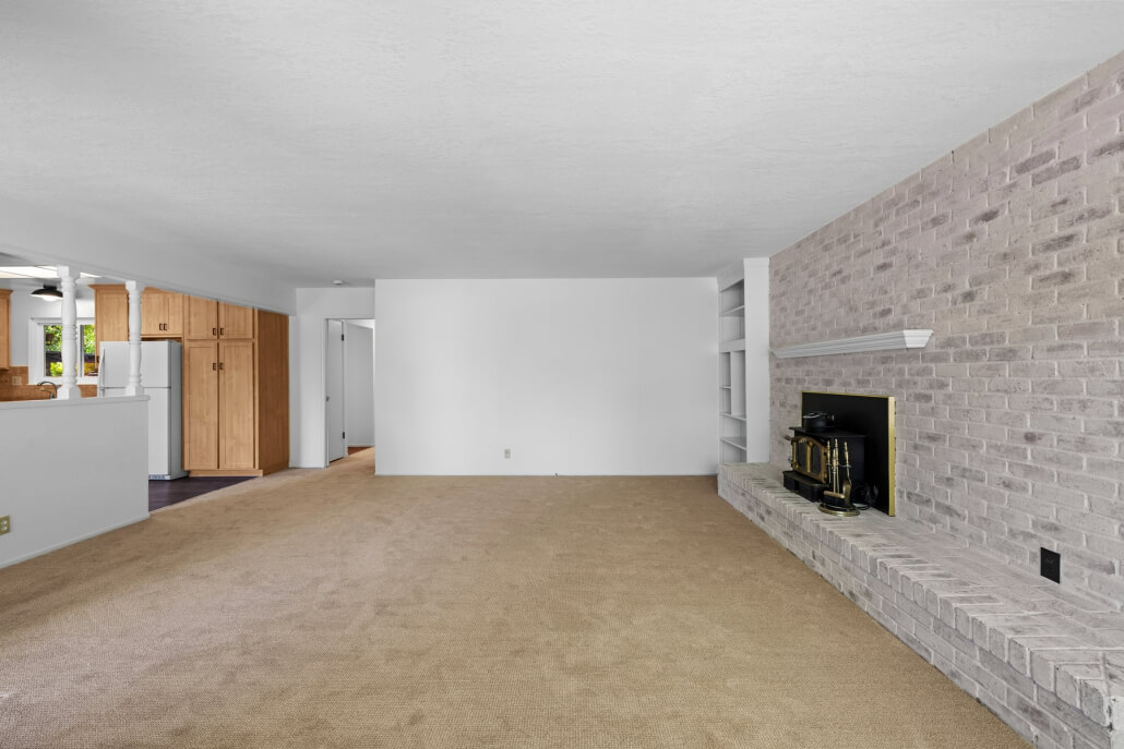 The spacious living room welcomes you with a generous picture window that frames the front yard and fills the space with natural light. A fireplace with a brick surround serves as a warm architectural focal point, its sophisticated limewashed finish honoring the home’s original character while introducing a fresh sense of refinement. The adjacent kitchen and dining area connect seamlessly to the living space, extending the home’s bright, airy feel.
