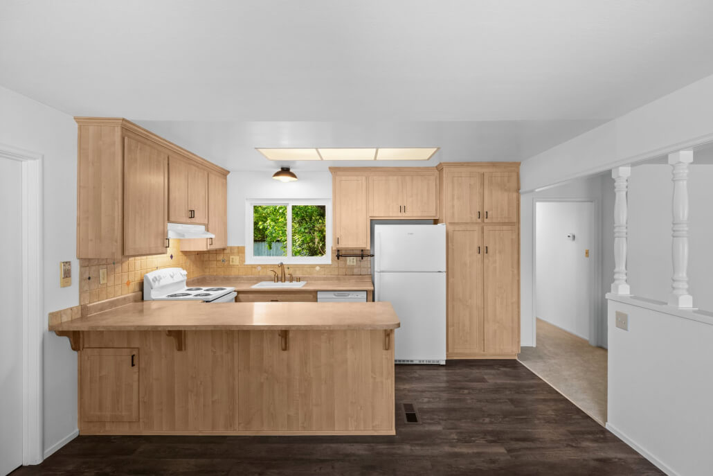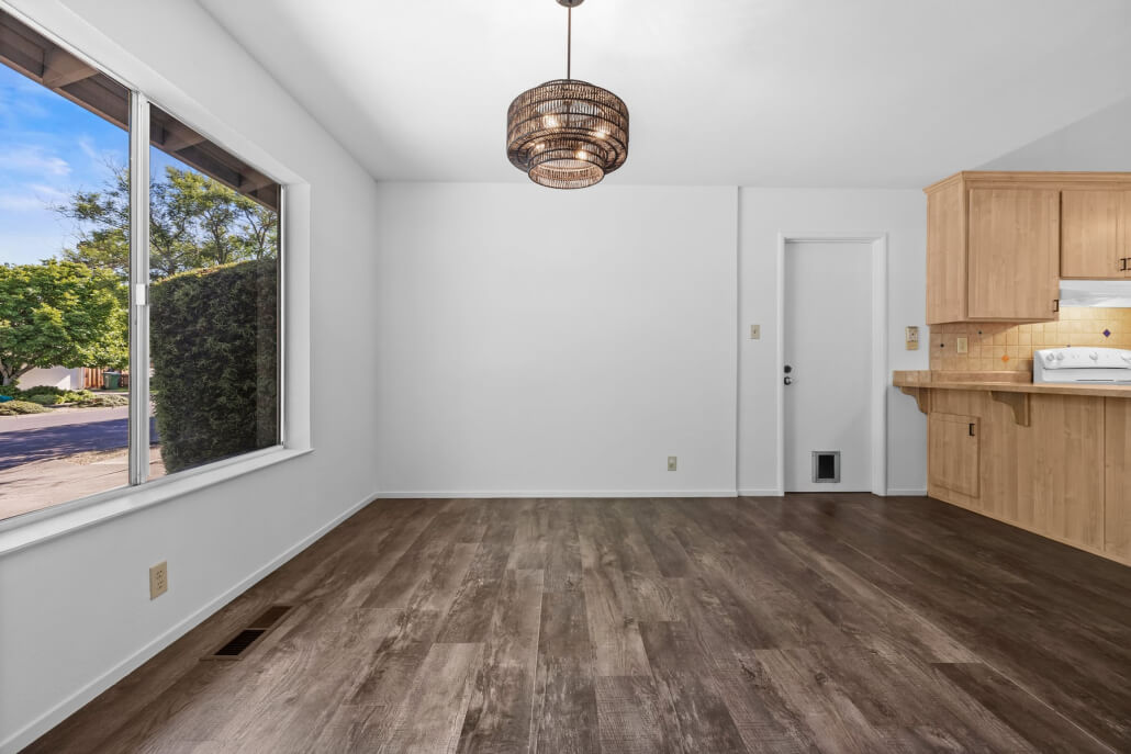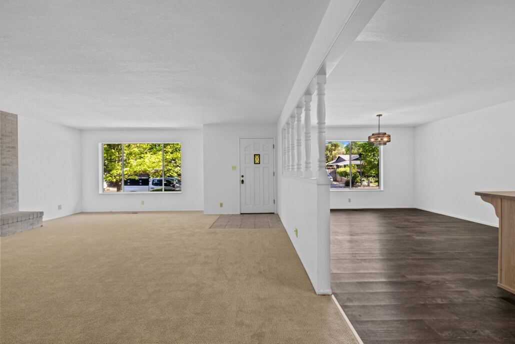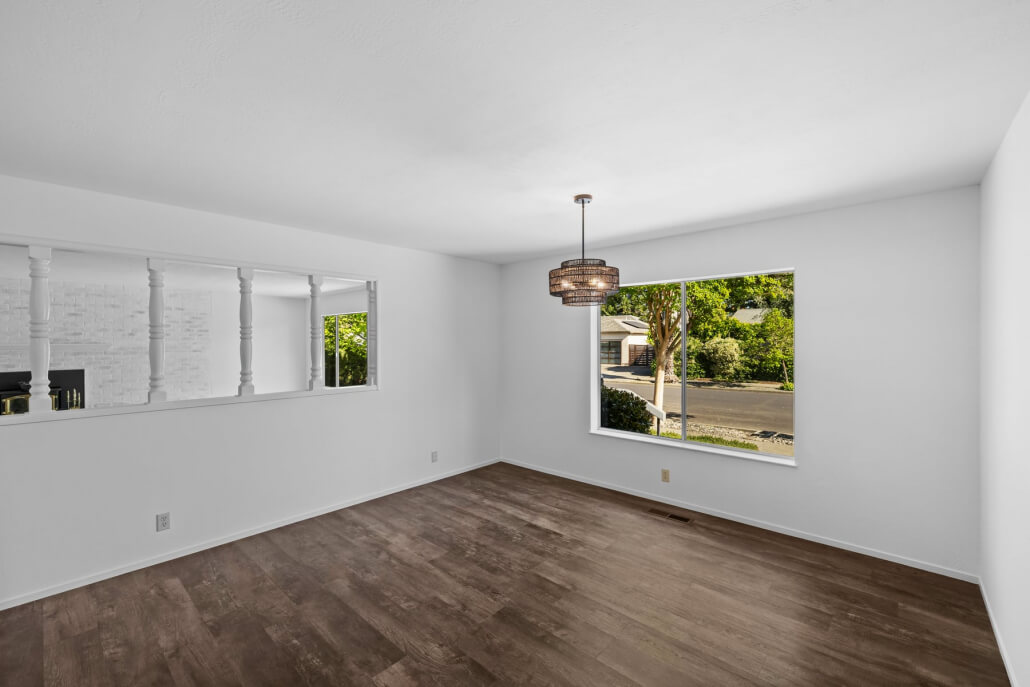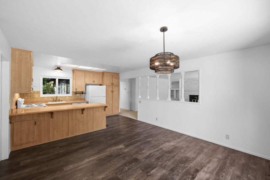 The spacious living room welcomes you with a generous picture window that frames the front yard and fills the space with natural light. A fireplace with a brick surround serves as a warm architectural focal point, its sophisticated limewashed finish honoring the home’s original character while introducing a fresh sense of refinement. The adjacent kitchen and dining area connect seamlessly to the living space, extending the home’s bright, airy feel.