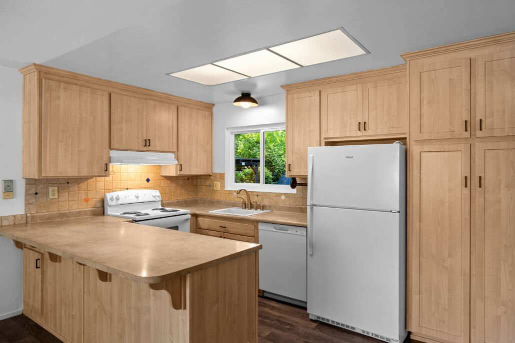 Open to both the dining area and living room, the kitchen offers an easy, connected layout well suited to everyday living and entertaining. Ample built-in cabinetry, recessed lighting, and new appliances—including a Whirlpool refrigerator, GE dishwasher, and GE electric range—enhance both functionality and convenience.