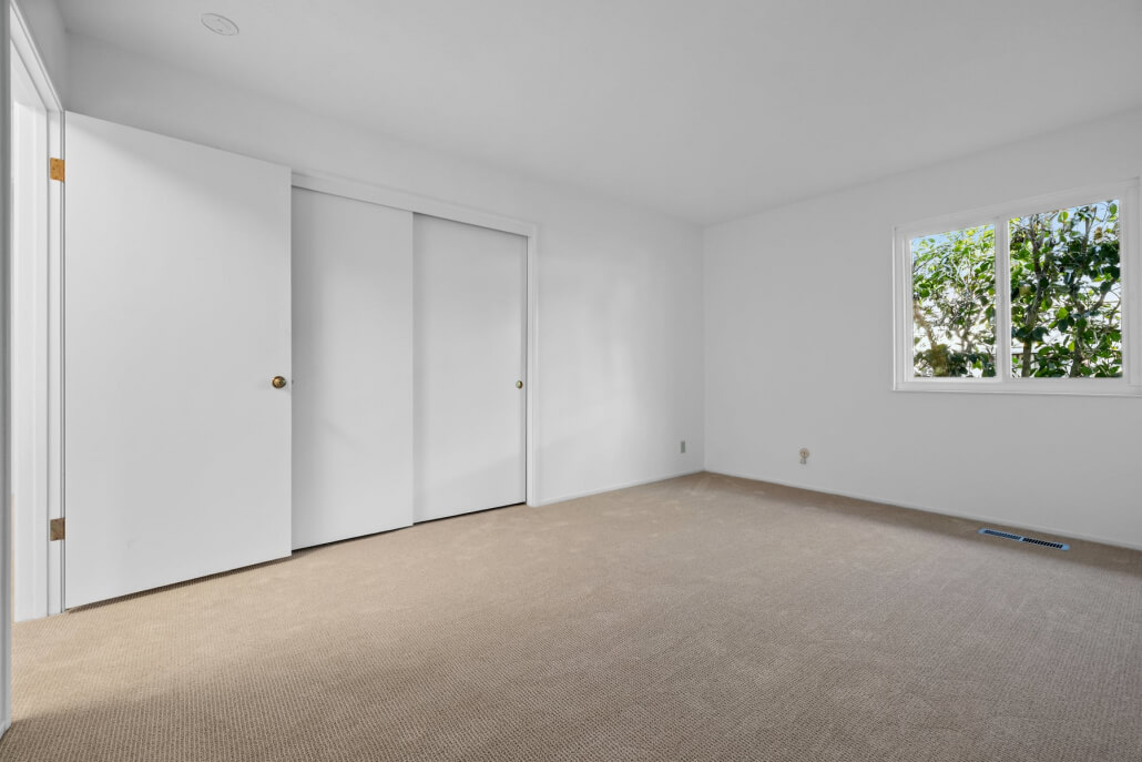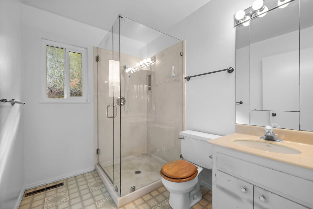 The guest bedroom is a comfortable and private space, featuring a spacious closet with built-in shelving and a window that overlooks the rear garden. A well-appointed full hallway bathroom serves guests with a custom glass shower surround.