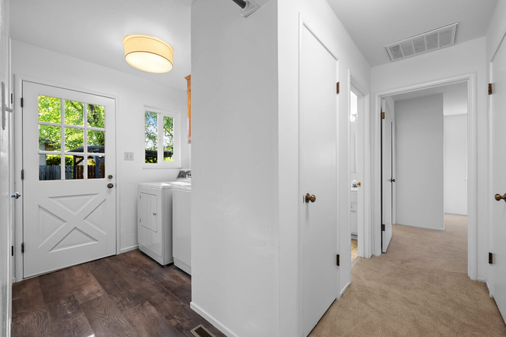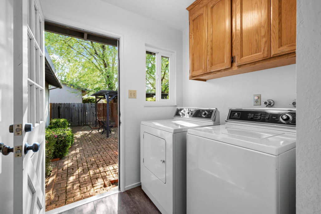 Just down the hall, a dedicated laundry room adds exceptional everyday utility, complete with a Maytag washer and dryer, upper storage cabinets, and direct access to the back patio and garden.