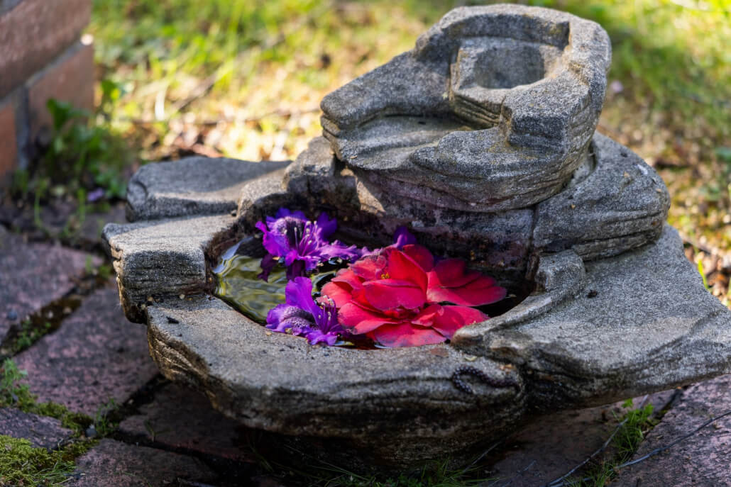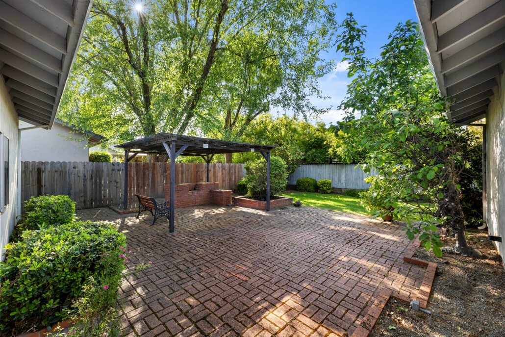 The secluded backyard is a quiet sanctuary, with a brick patio, level lawn, Zen garden corner, and mature trees that cast pleasant filtered light throughout the day.