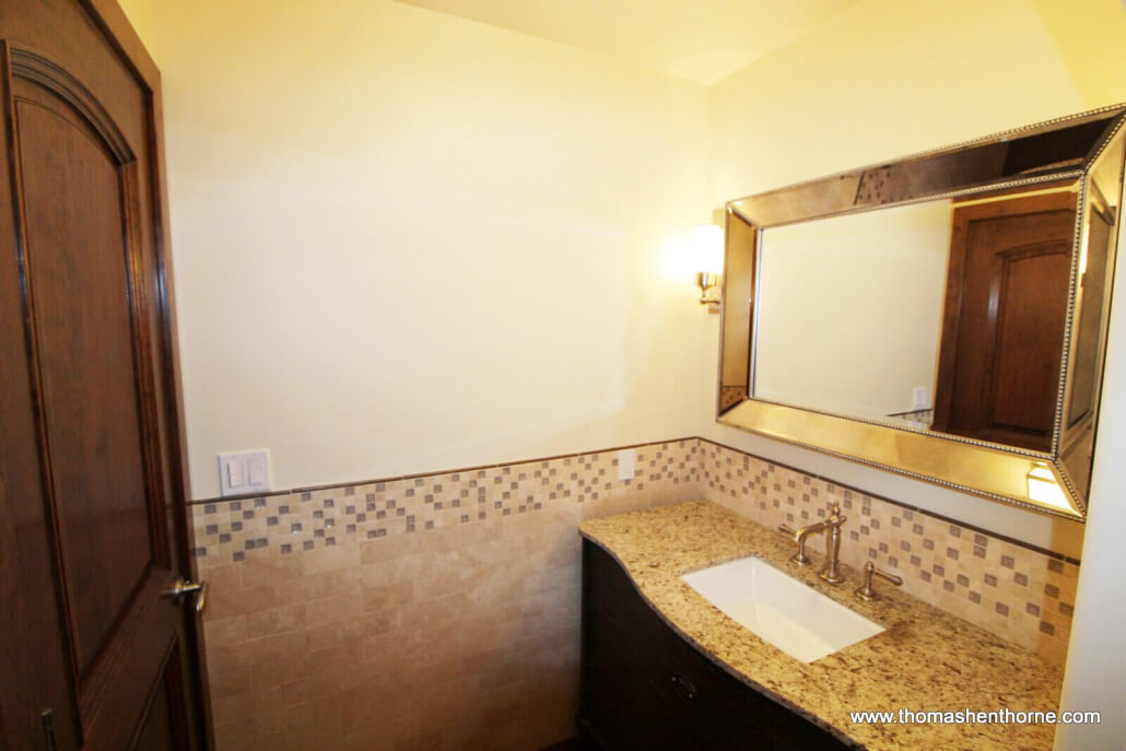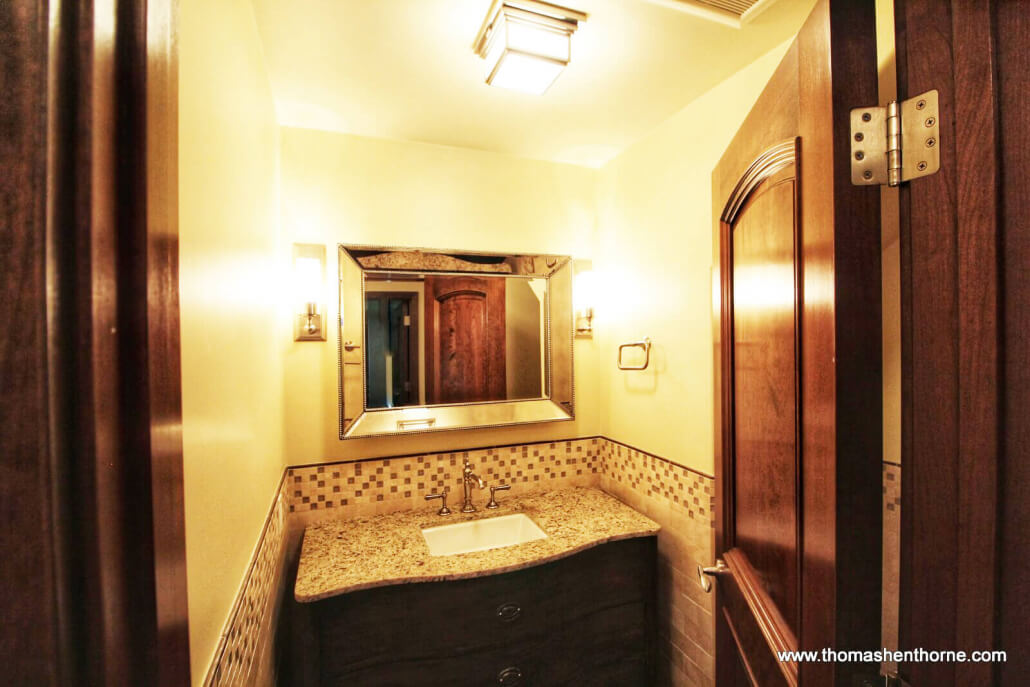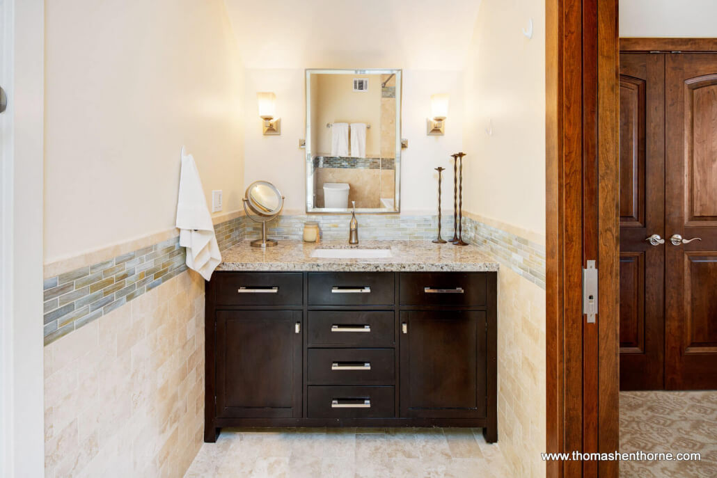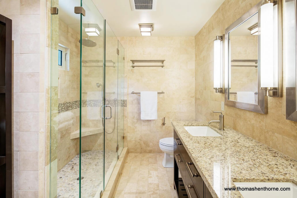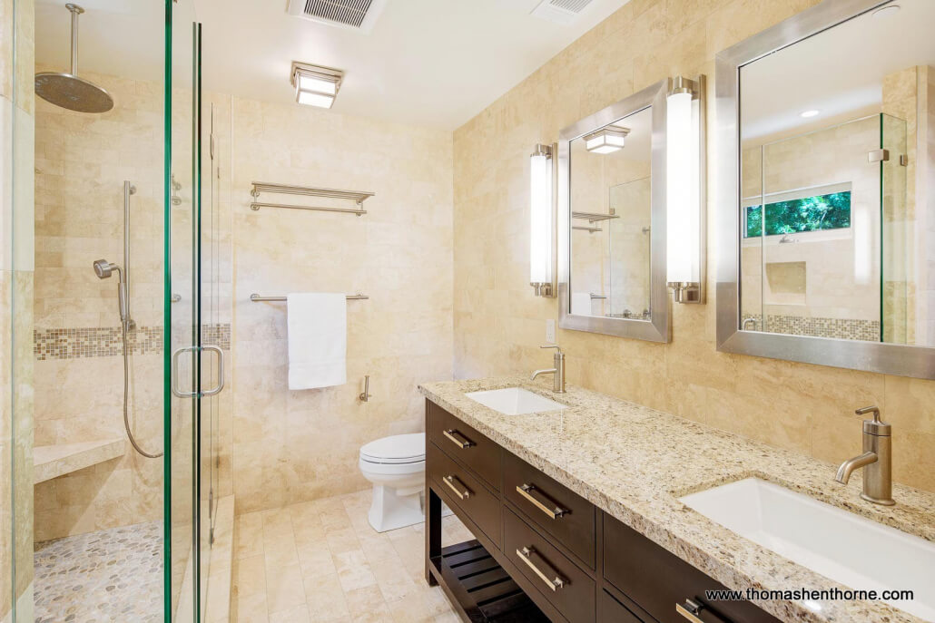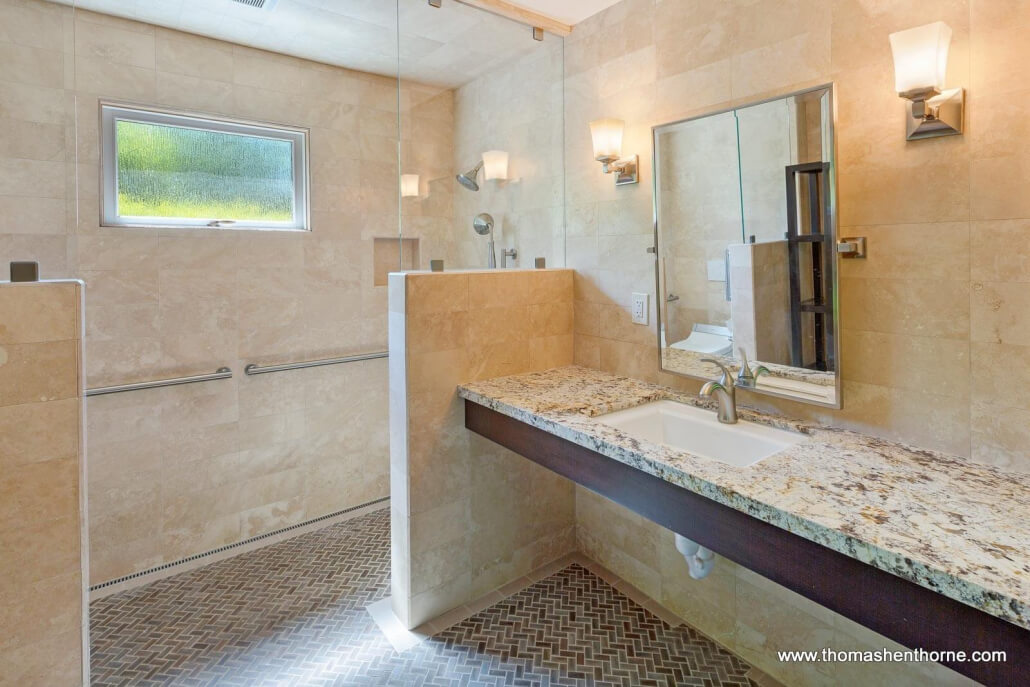 The spacious master and guest bedrooms are conveniently situated on the main level and both feature remodeled en-suite baths with nickel fixtures and stone vanities. The shower and vanity in the guest bedroom is thoughtfully designed to facilitate wheelchair access.