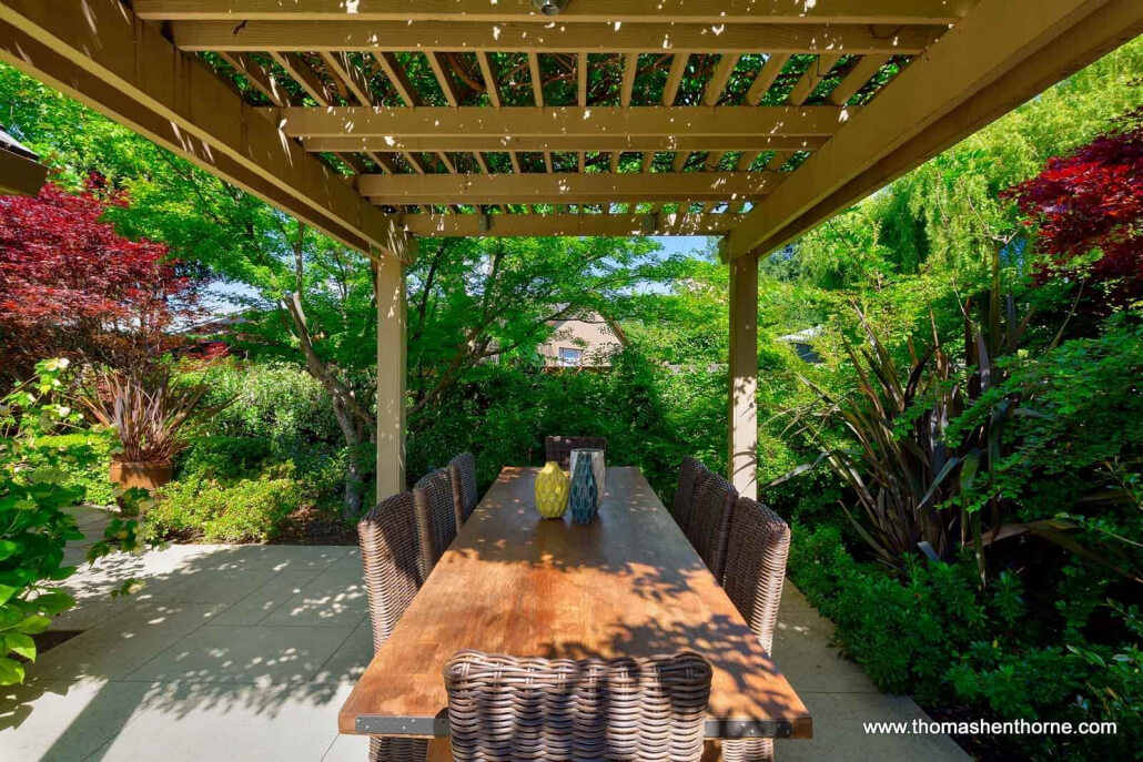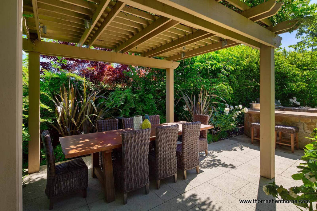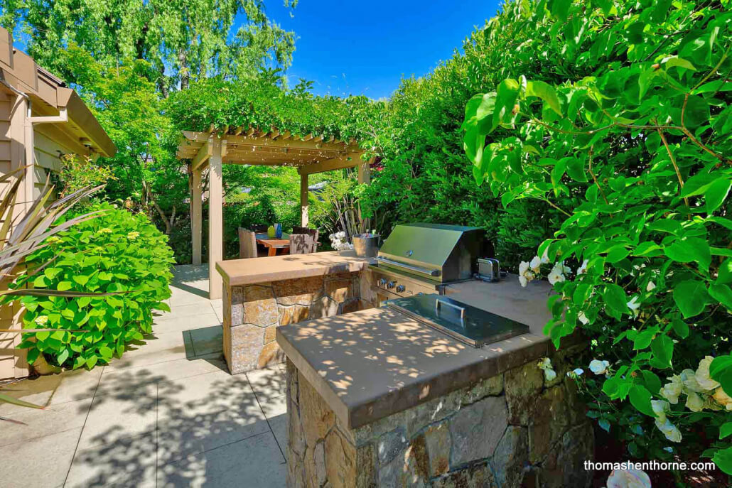 The magical outdoor oasis designed by award-winning landscape architect Lori Cagwin is truly one of Yountville’s most stunning private gardens. Designed with outdoor living and entertaining in mind, the back garden is a series of outdoor rooms connected by graceful pathways and surrounded by lush, mature landscaping and privacy hedges. The east side features a trellis-covered dining area located next to an outdoor kitchen, complete with gas Viking Grill and cooktop.