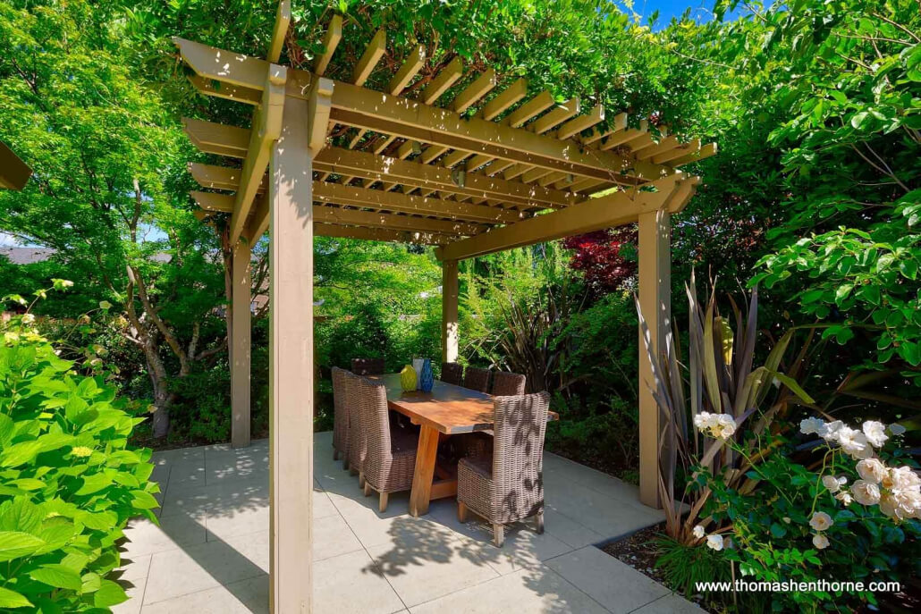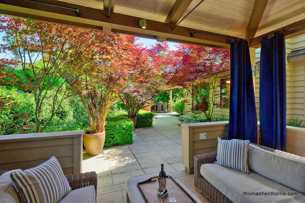 The “star” of the garden is the outdoor living room on the west side of the property, complete with shingled roof, privacy curtains, gas stone fireplace, Viking refrigerator for chilling wine, and a ceiling fan, perfect for sipping wine on those warm summer nights.