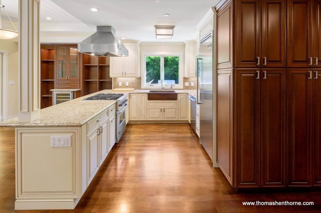 The open-concept main living area in this beautiful Yountville residence features a spacious modern chef’s kitchen, living room and dining area that flows effortlessly through double French doors to the outdoor living spaces. There are beautiful cherry hardwood floors throughout. The living room features high ceilings, a cozy gas fireplace, electric window shades, built-in cabinetry, a wine chiller and many custom finishes.