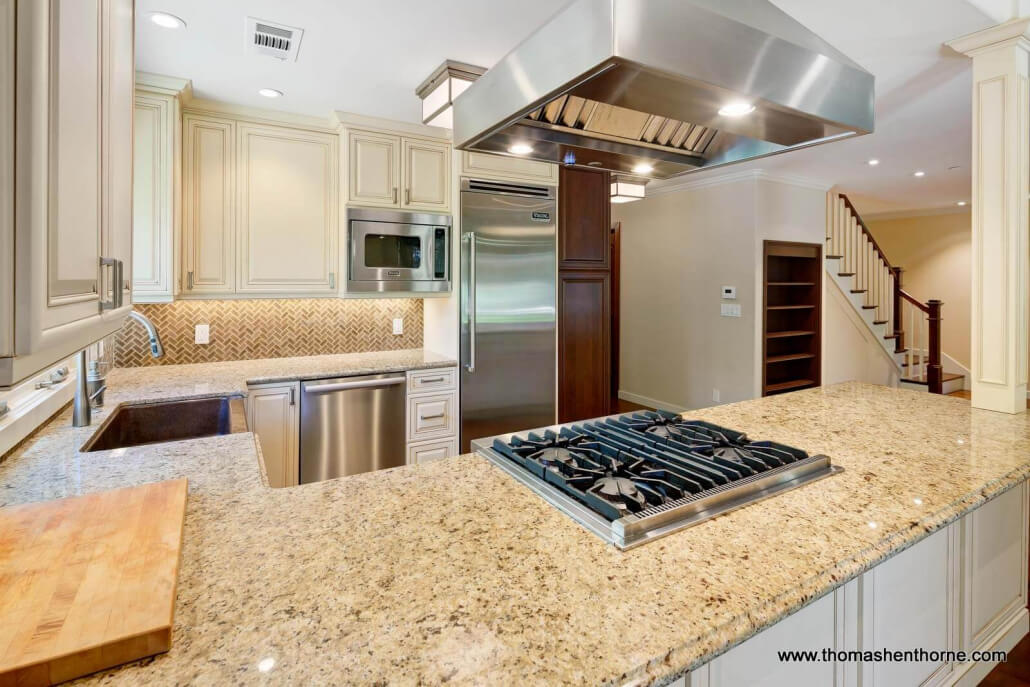 The stunning chef’s kitchen is open to the living / dining area and features Viking appliances, Brookhaven custom cabinetry, a farmhouse sink and granite counter tops. There is ample counter space for entertaining and meal preparation.