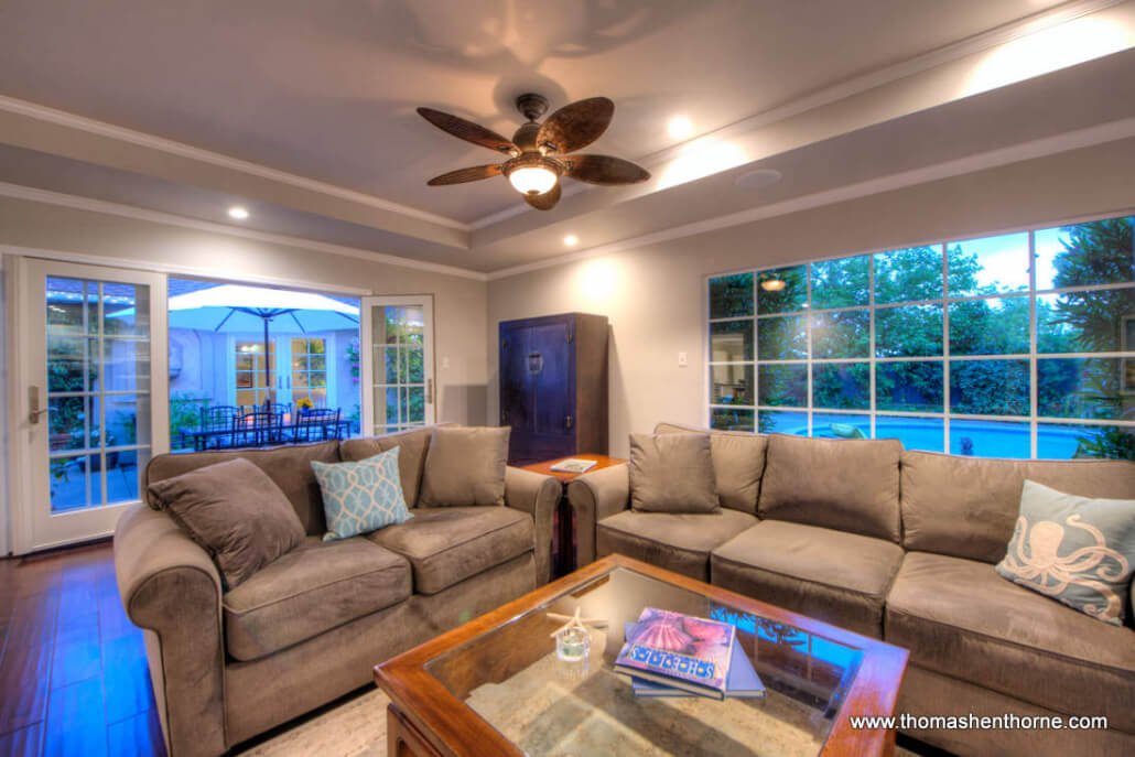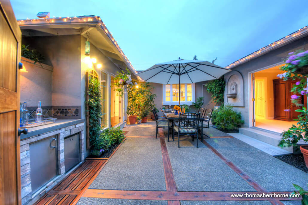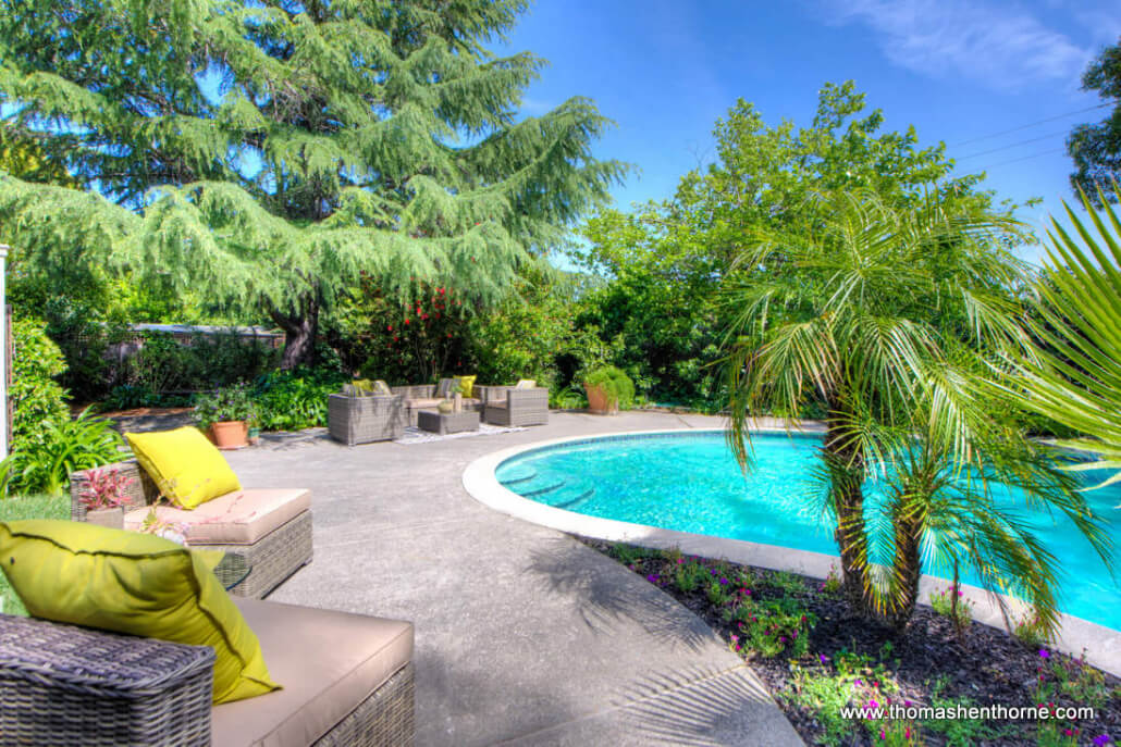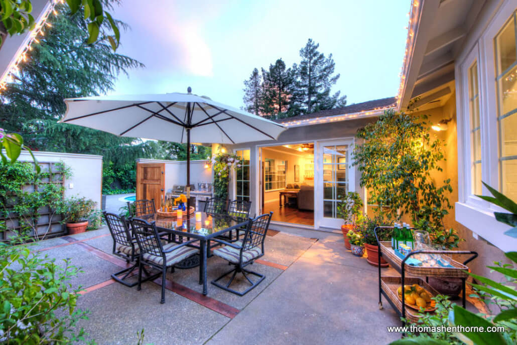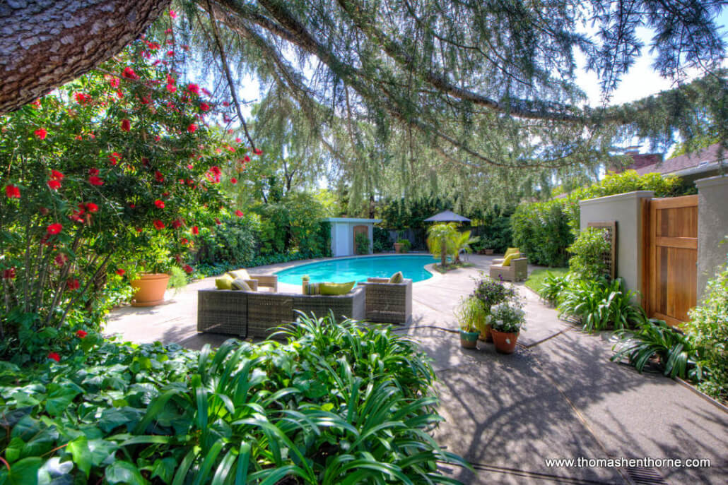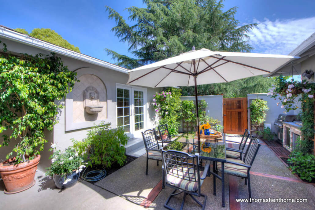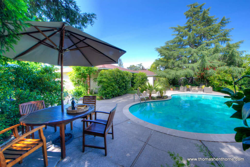 The home’s open floor plan flows effortlessly out to a private backyard oasis, which includes an intimate center courtyard ideal for dining al fresco, an inviting in-ground swimming pool, large patio for lounging and ample space for gardening. Indoor and outdoor speakers make this the perfect home for entertaining and relaxation. The manicured front garden is fully fenced and offers privacy and a relaxing vantage point to view Mt. Tam.