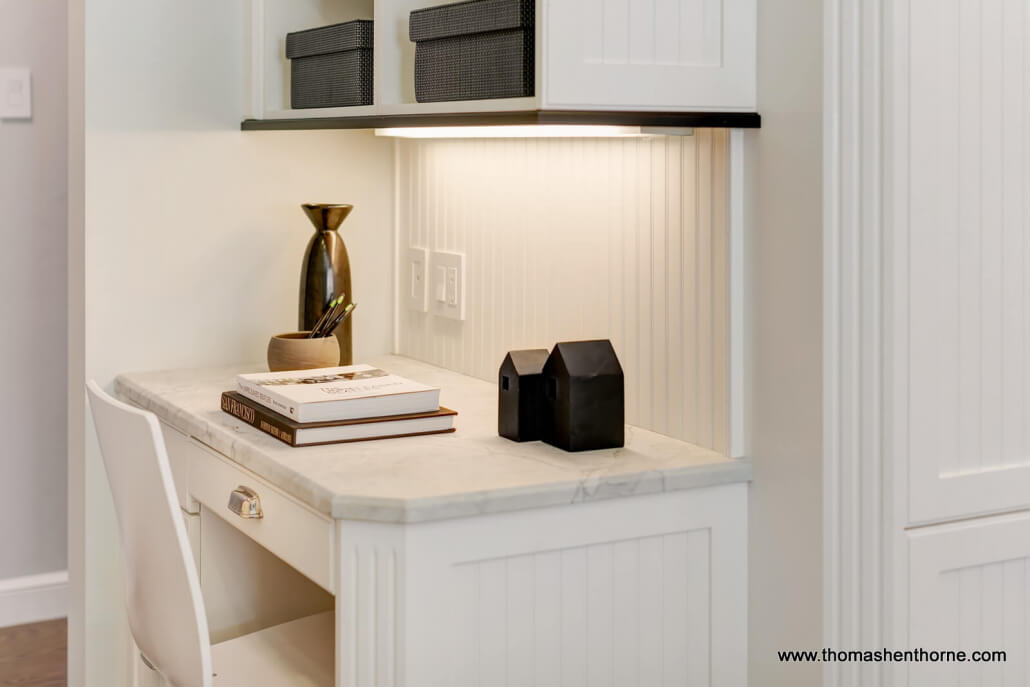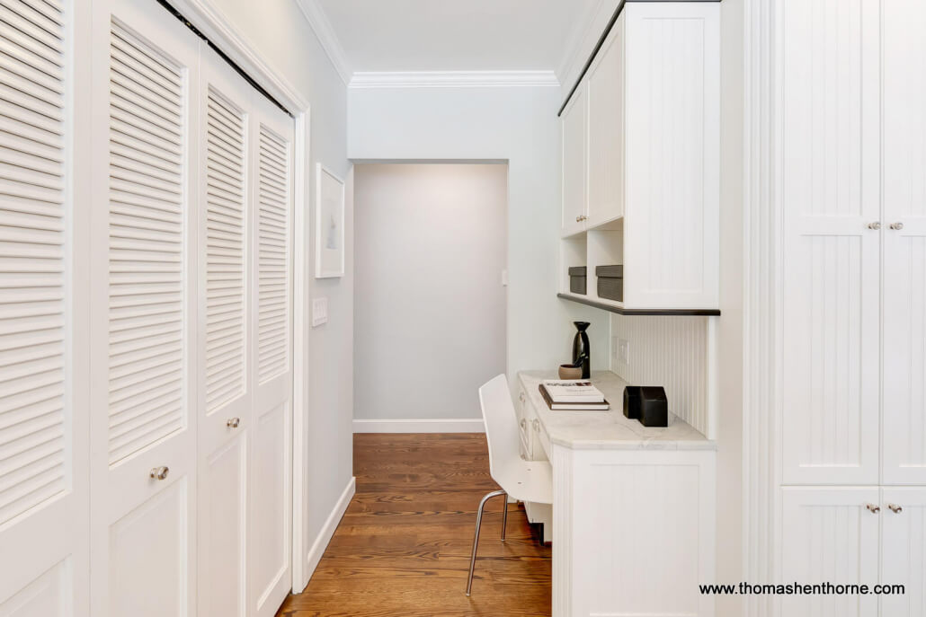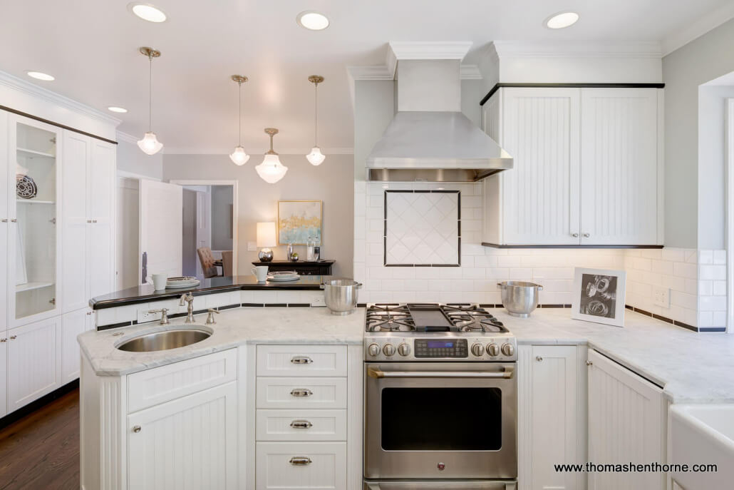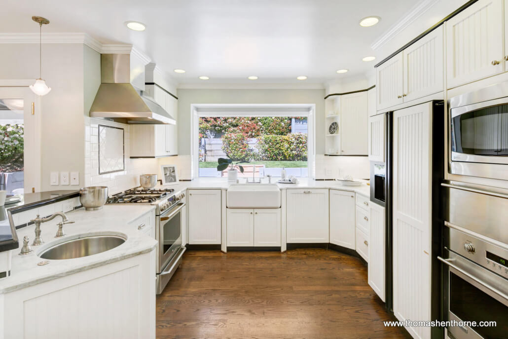 The beautifully remodeled eat-in kitchen looks out to the backyard and features Carrera marble countertops, subway tile backsplash, custom cabinetry with plenty of storage, a Shaws farmhouse sink plus a second prep sink. Stainless appliances include a four-burner gas range with griddle and hood and a GE profile oven with separate microwave and warming drawer. The side-by-side refrigerator/freezer and dishwasher are faced to match the gorgeous shaker cabinetry.