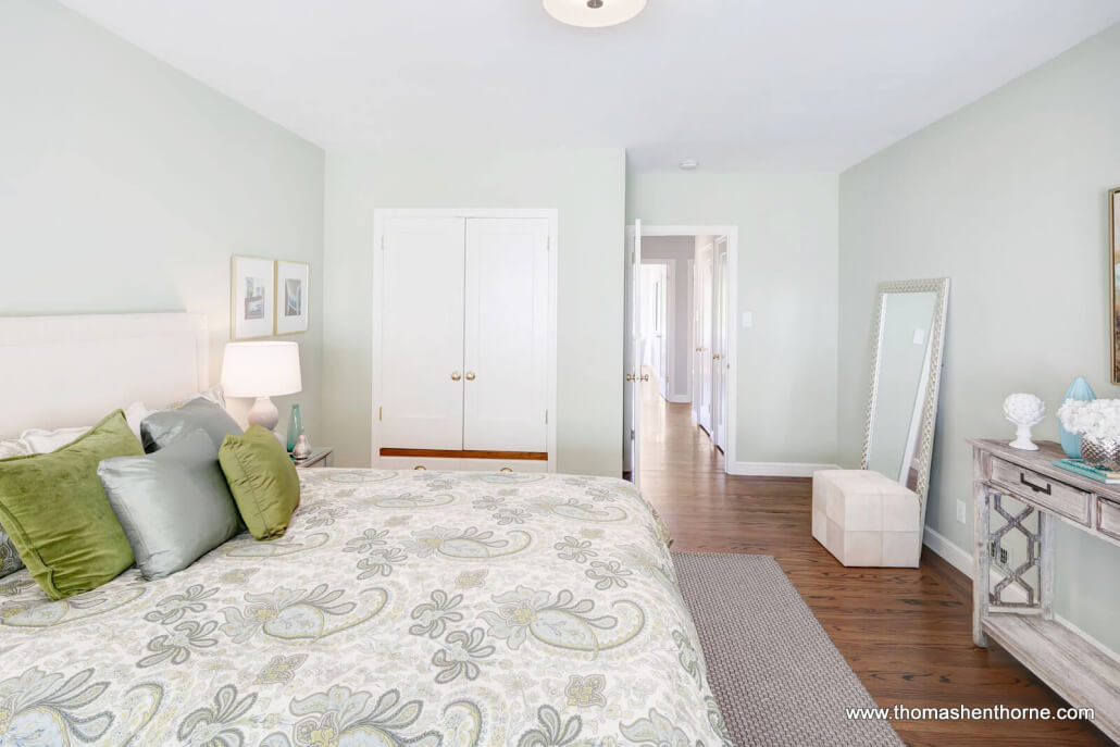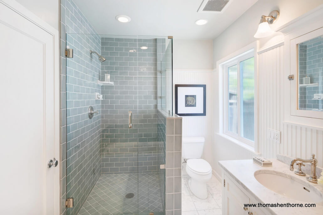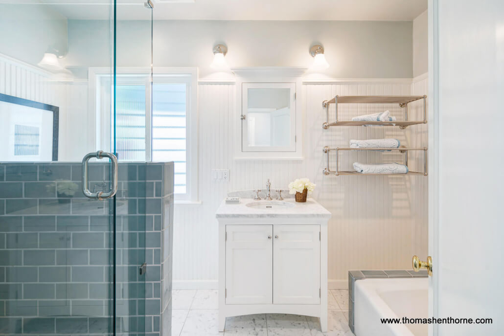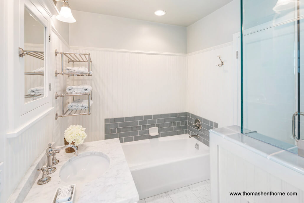 The two front bedrooms look out over the front yard and neighborhood, while the spacious master bedroom looks to the back yard and patio. The remodeled bathroom features a separate tile shower with a custom glass surround, a relaxing soaking tub, a marble-topped vanity, marble tile floors and beadboard walls.