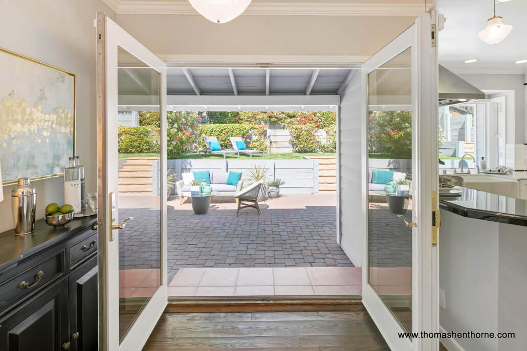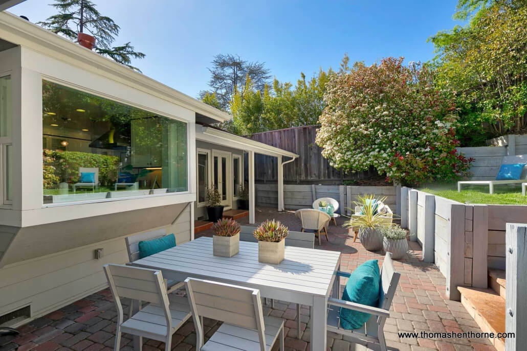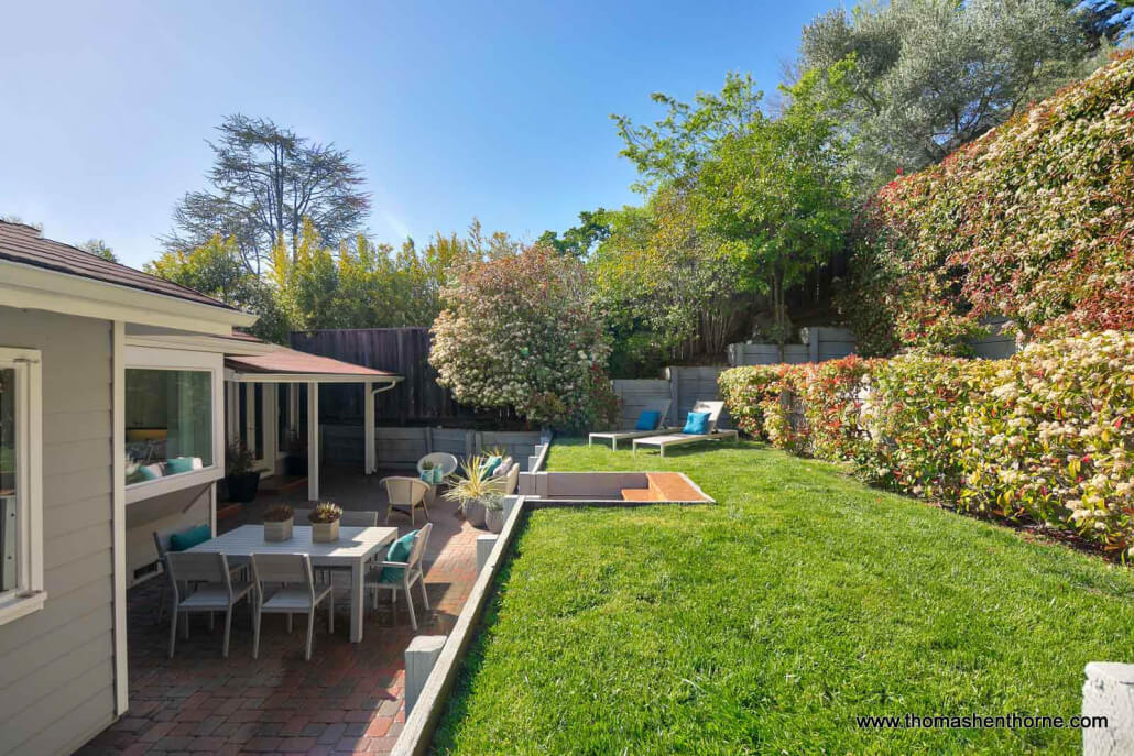 The dining room and kitchen open out to the spacious brick patio through French doors, providing wonderful indoor / outdoor flow for entertaining. The inviting patio provides the perfect spot for dining al fresco. A terraced lawn area is located just above the patio. The 7,950 sq ft lot extends well beyond the back garden’s privacy hedge.