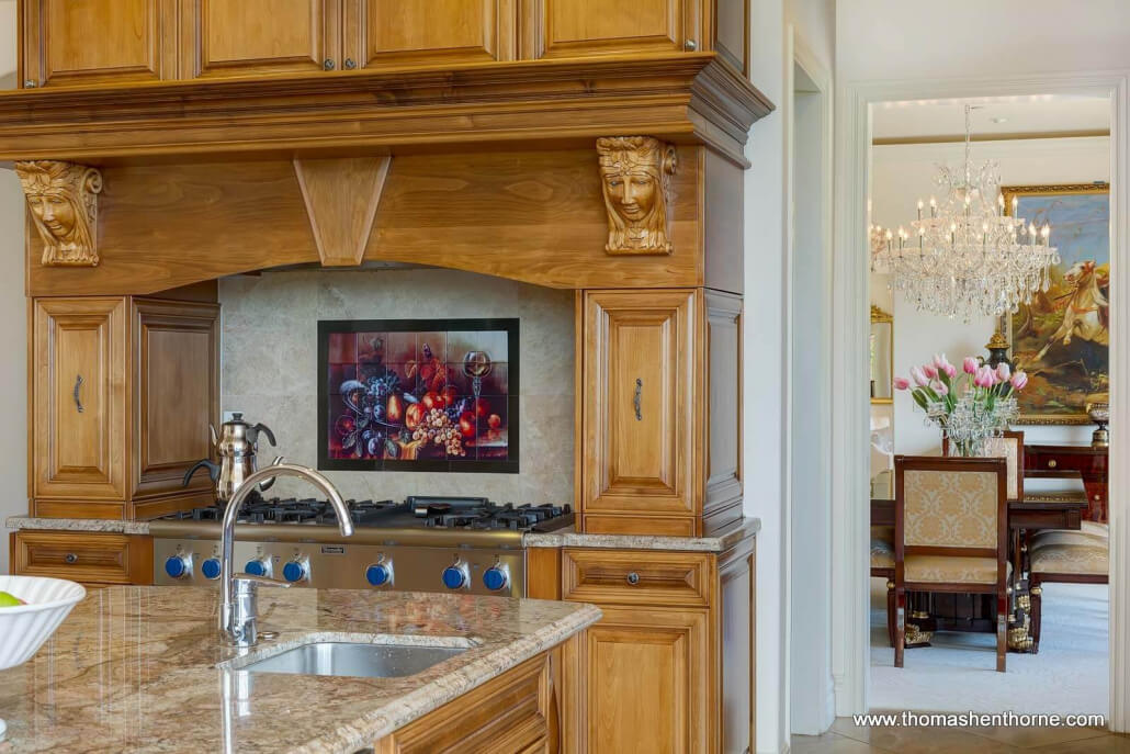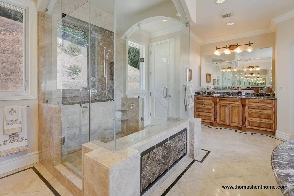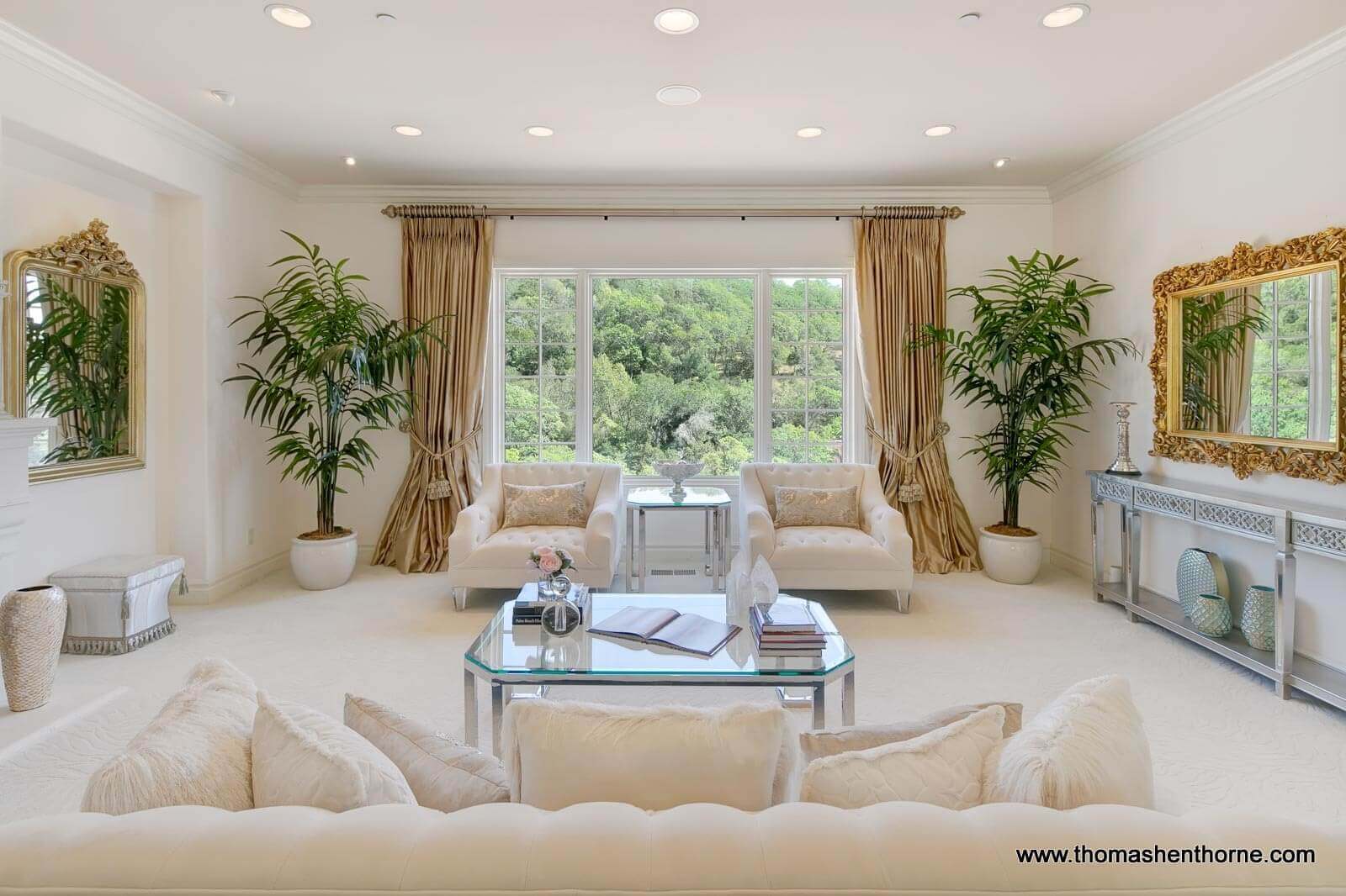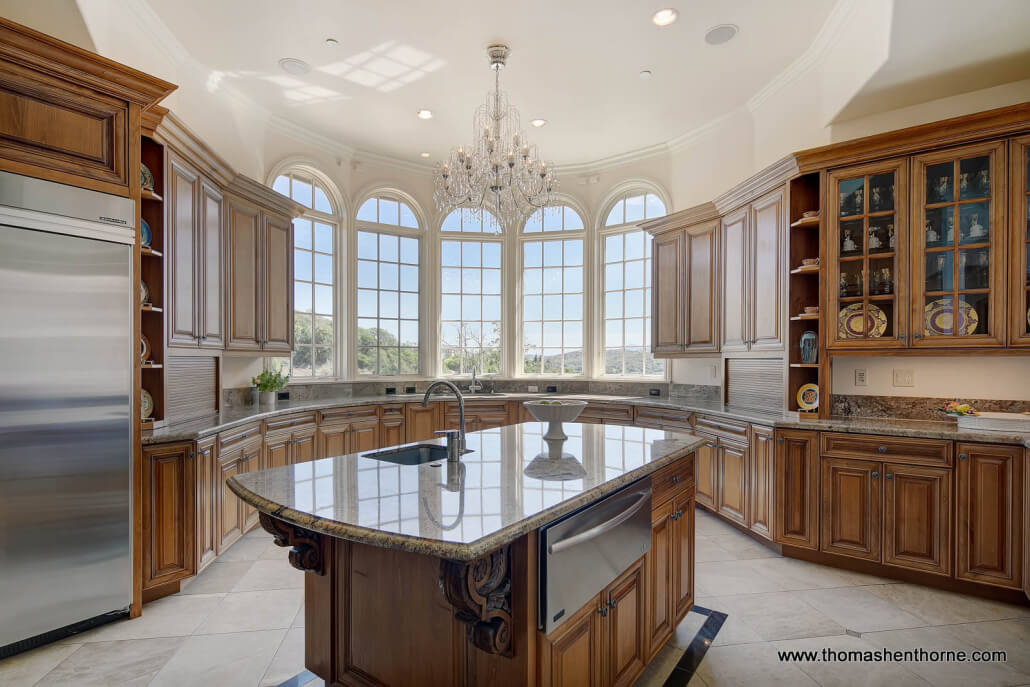 The spacious open-concept kitchen is truly an entertainer’s dream. Open to the family room, and adjacent to the dining room for ease of service, the kitchen’s soaring ceilings are accentuated by a spectacular chandelier in the center of the room. A stunning curved wall of windows floods the kitchen with natural light and offers panoramic views all the way to Mount Tamalpais.