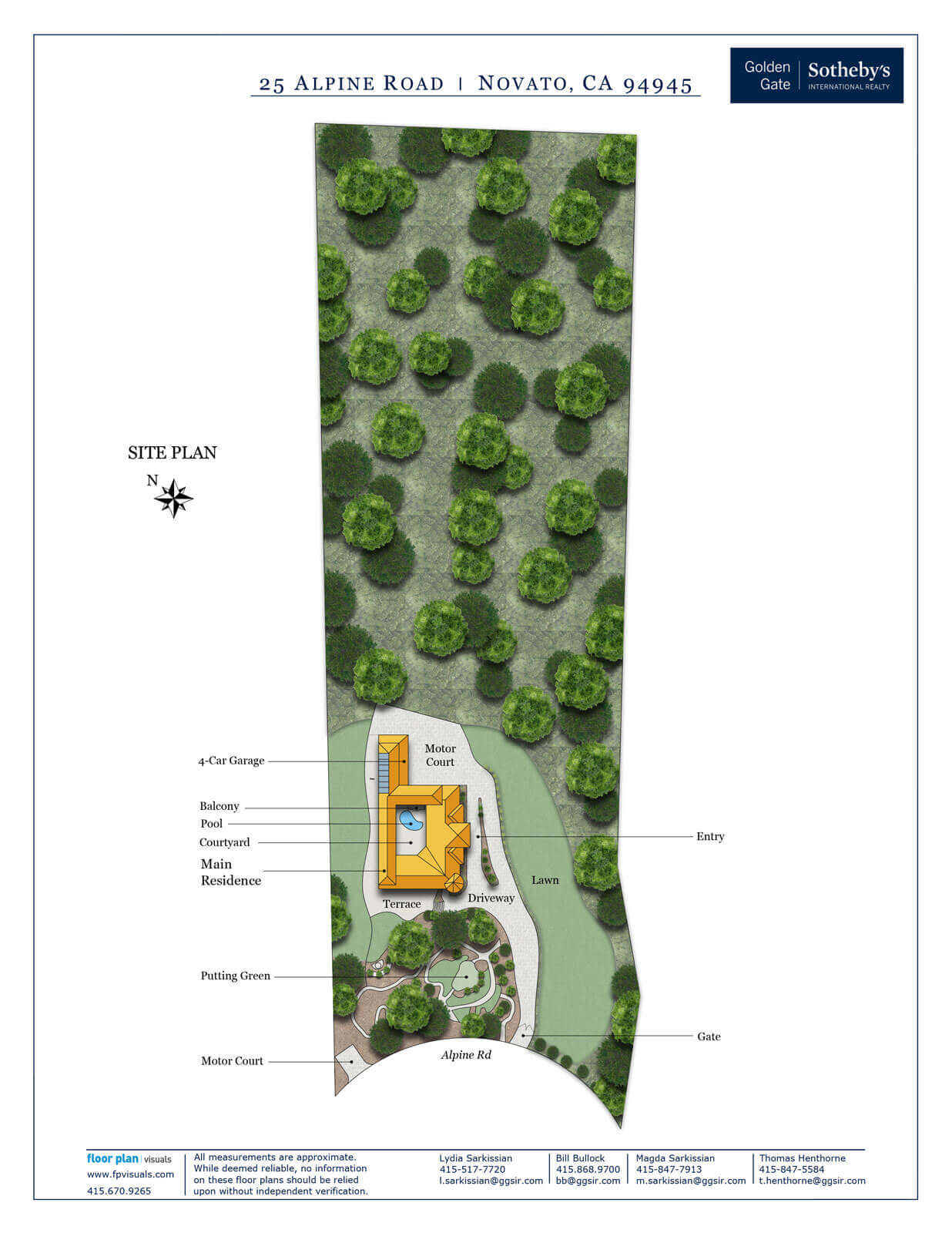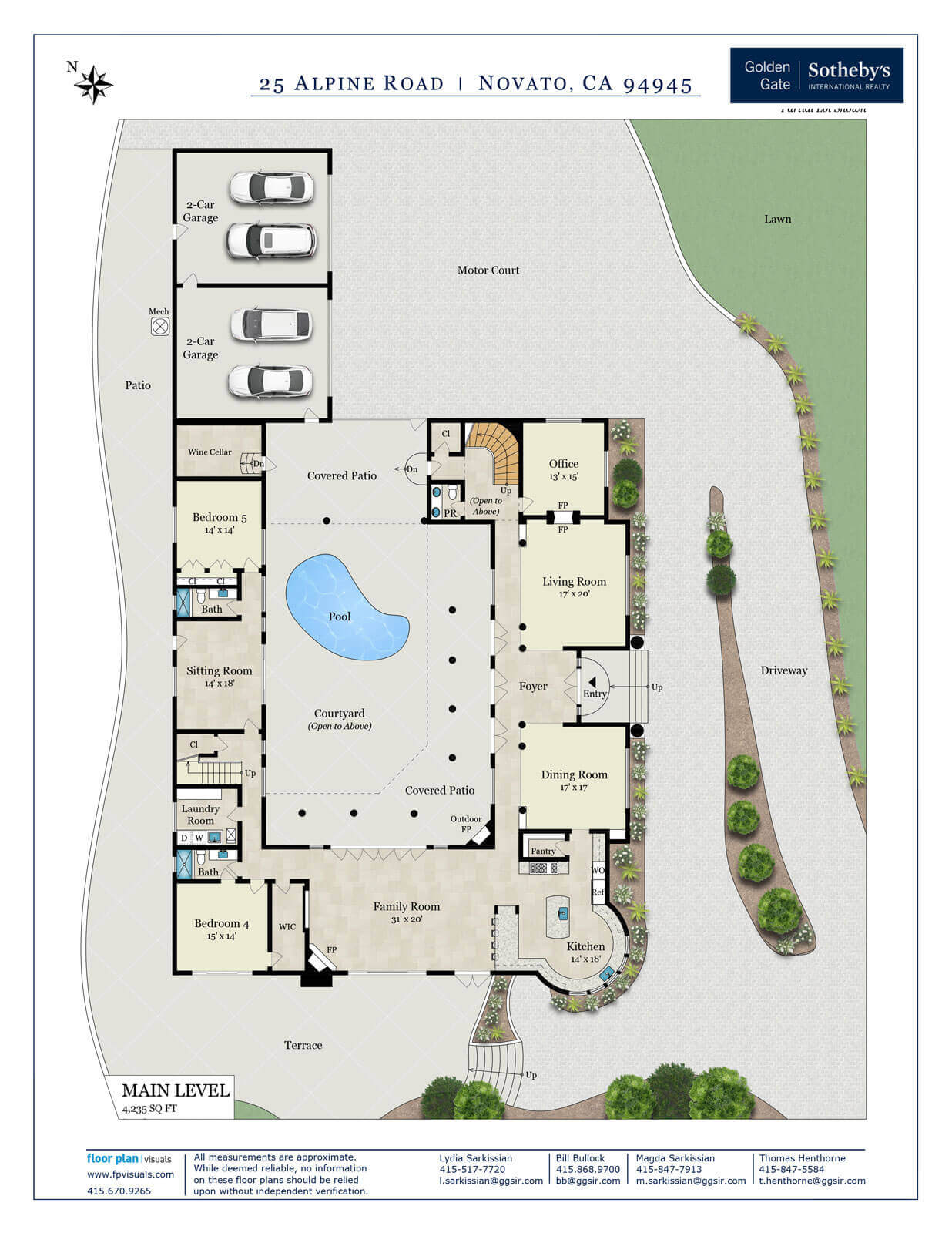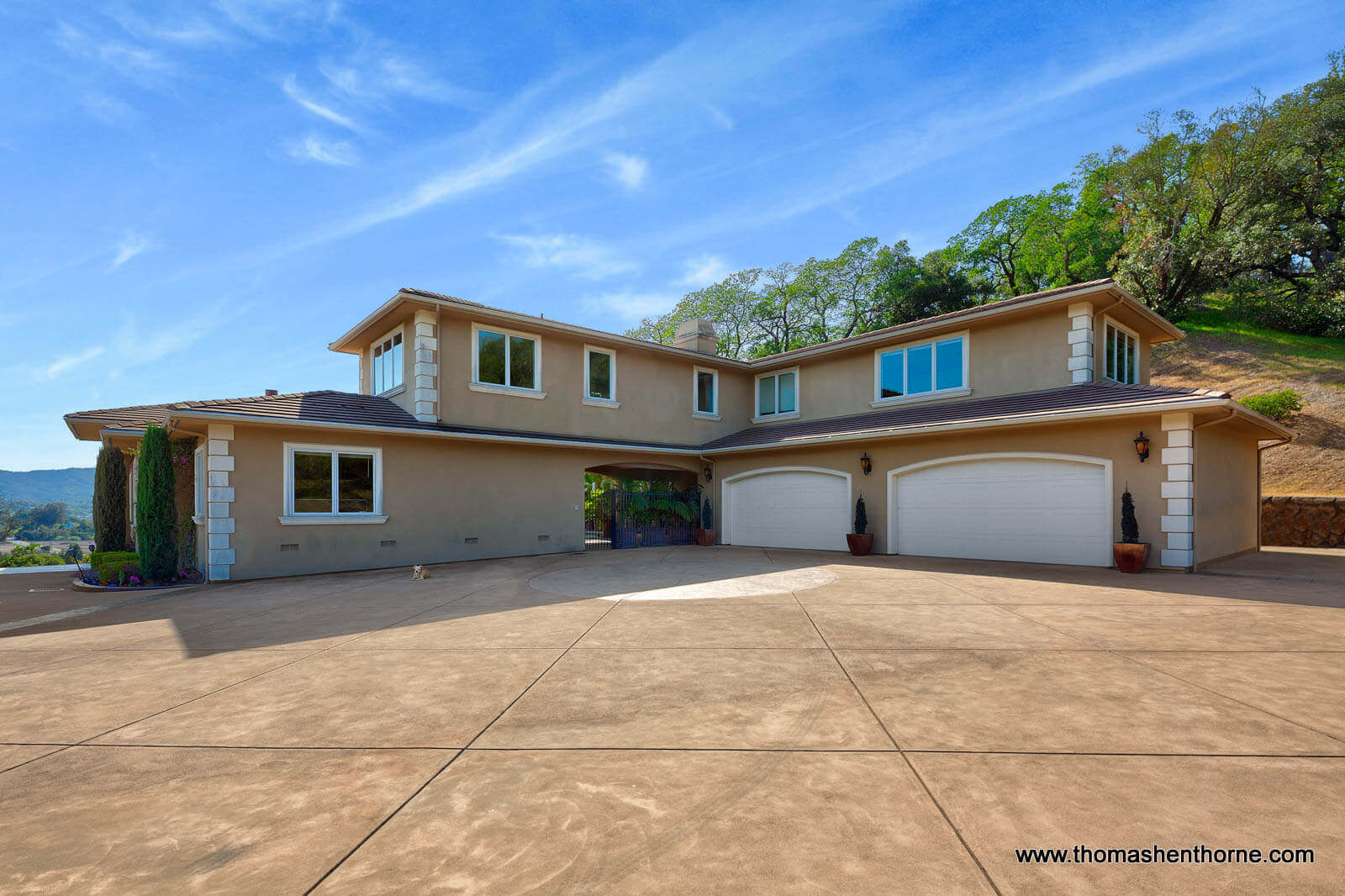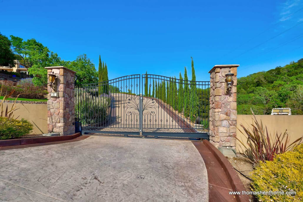 25 Alpine Road, Novato — Welcome to one of Marin County’s grand estates, perched atop a private knoll at the end of prestigious Alpine Road in the exclusive Greenpoint neighborhood. Situated on 5.27 acres with commanding views of the Marin countryside and Mount Tamalpais, this opulent 5 BR / 5.5 BA 6,785 square foot gated estate is adorned with custom architectural details and top-of-the-line premium finishes throughout. Designed for entertaining, the home’s open-concept kitchen and large-scale rooms flow effortlessly out to multiple outdoor living areas including a stunning central courtyard, reminiscent of a boutique resort with its spacious, private patio and inviting pool.