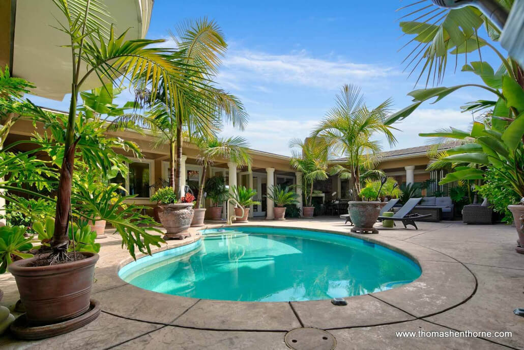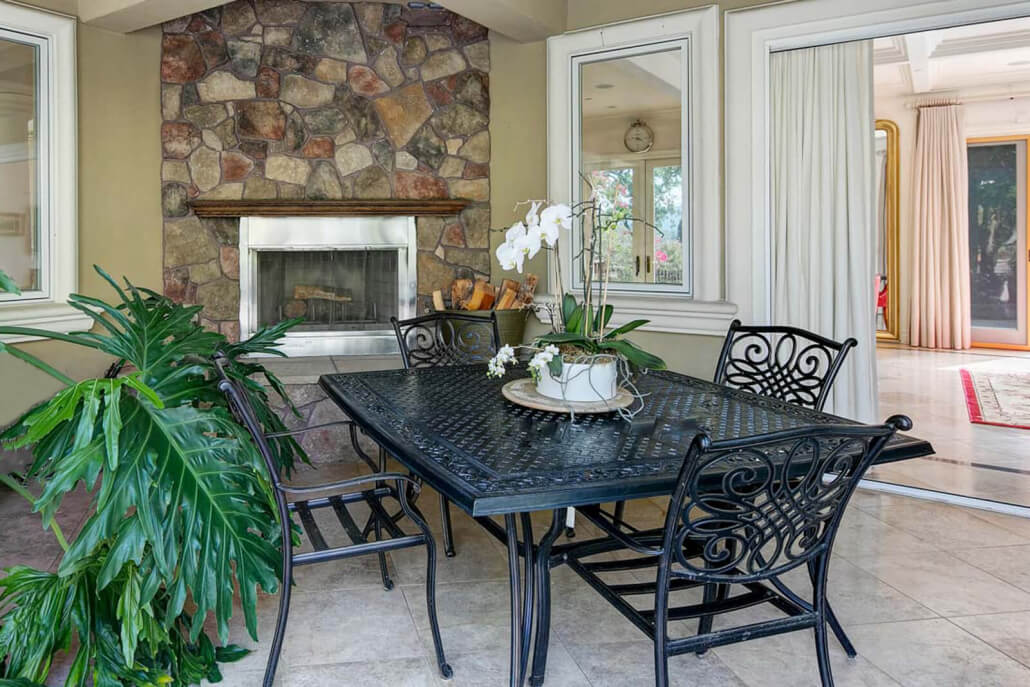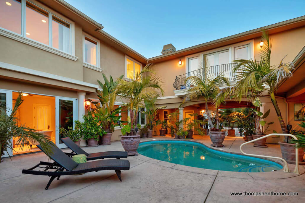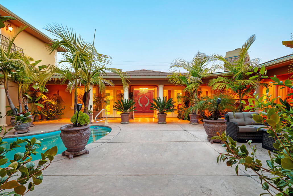 The courtyard features an inviting pool and spacious patio, providing ample room for sunbathing, entertaining and dining al fresco. There is also a cozy outdoor fireplace, ideal for enjoying cooler evenings.