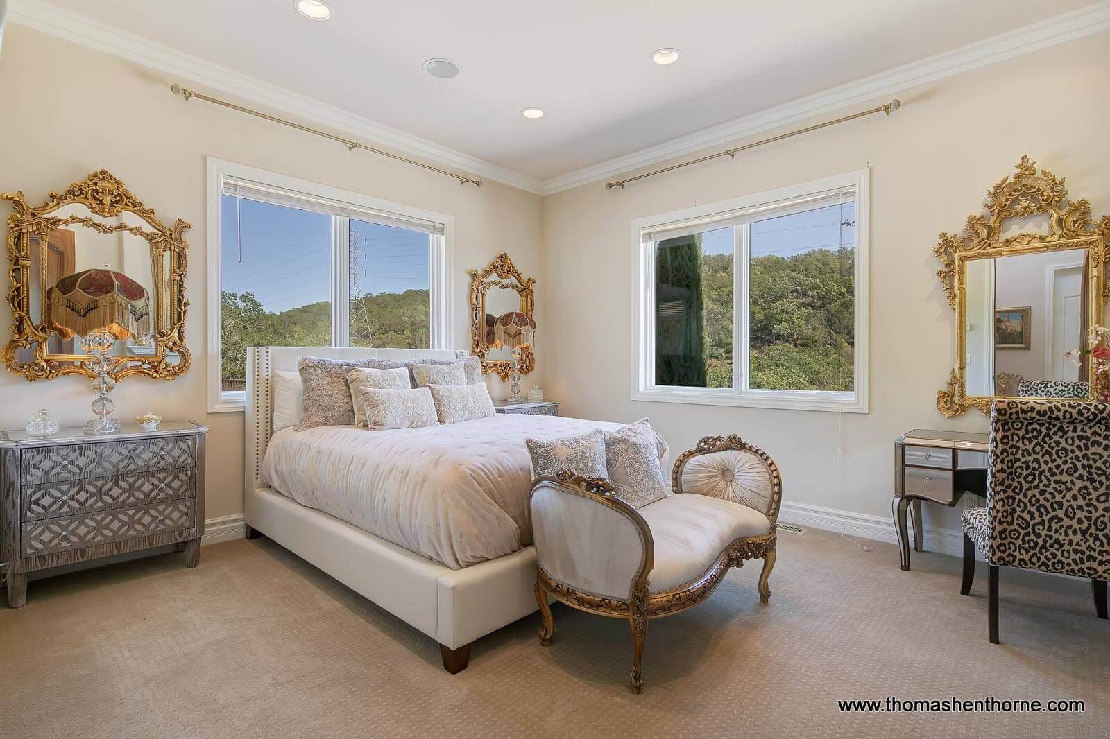 The grand master suite features a balcony with French doors that overlooks the central courtyard and boasts views of Mount Tamalpais. There is an enormous walk-in closet and a large room adjacent to the master suite that would be ideal as a home office or gym.
