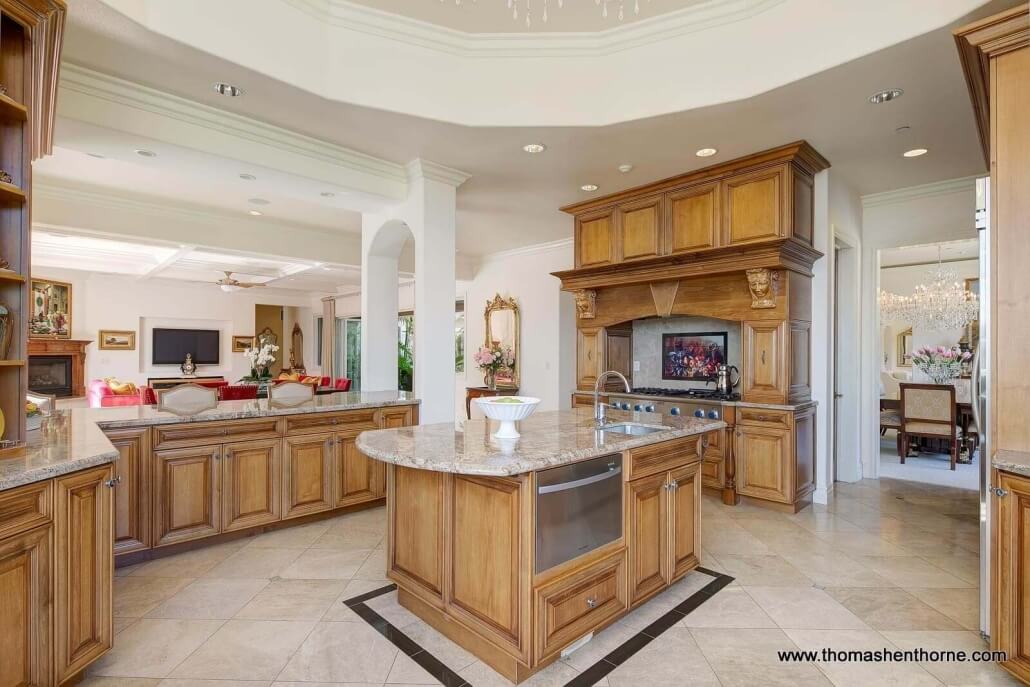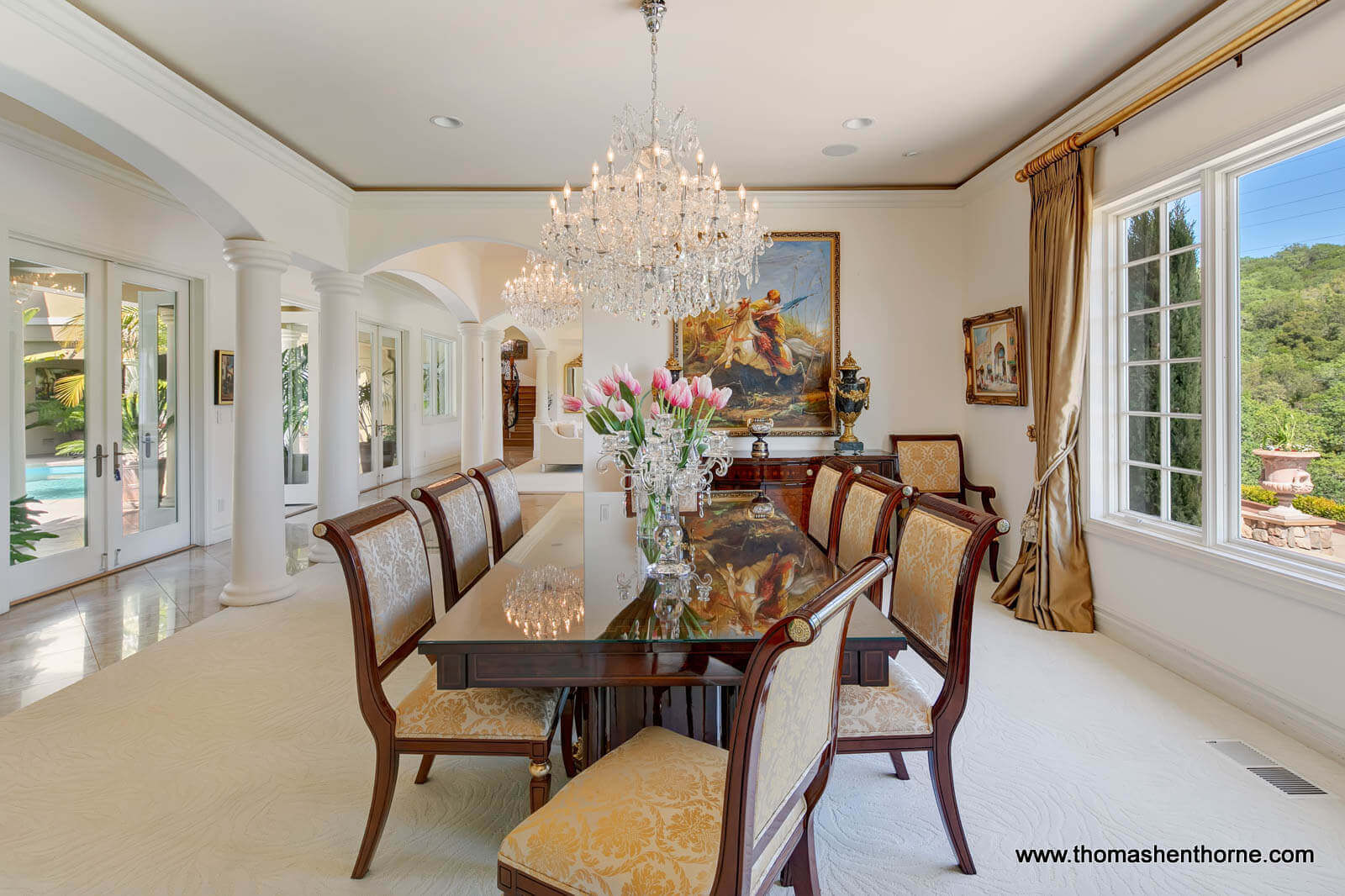 The large formal living and dining rooms are located to the left and right of the entry foyer respectively and are accentuated by the home’s architectural arches and columns. The living room features a gas fireplace. Both sun-filled rooms enjoy views of the distant hills and feature French doors that open out to the home’s central courtyard.