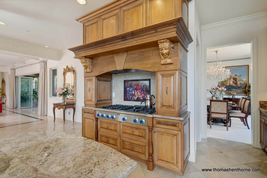 The premium stainless appliances include a Kitchen Aid refrigerator, a Thermador cooktop and dishwasher, dual sinks, dual Thermador ovens, and a Fisher & Paykel drawer dishwasher great for wine glasses. The high-end custom cabinetry features intricate woodwork details and marble countertops. The kitchen also features a large walk-in pantry, a center island and a bar for quick, casual dining.