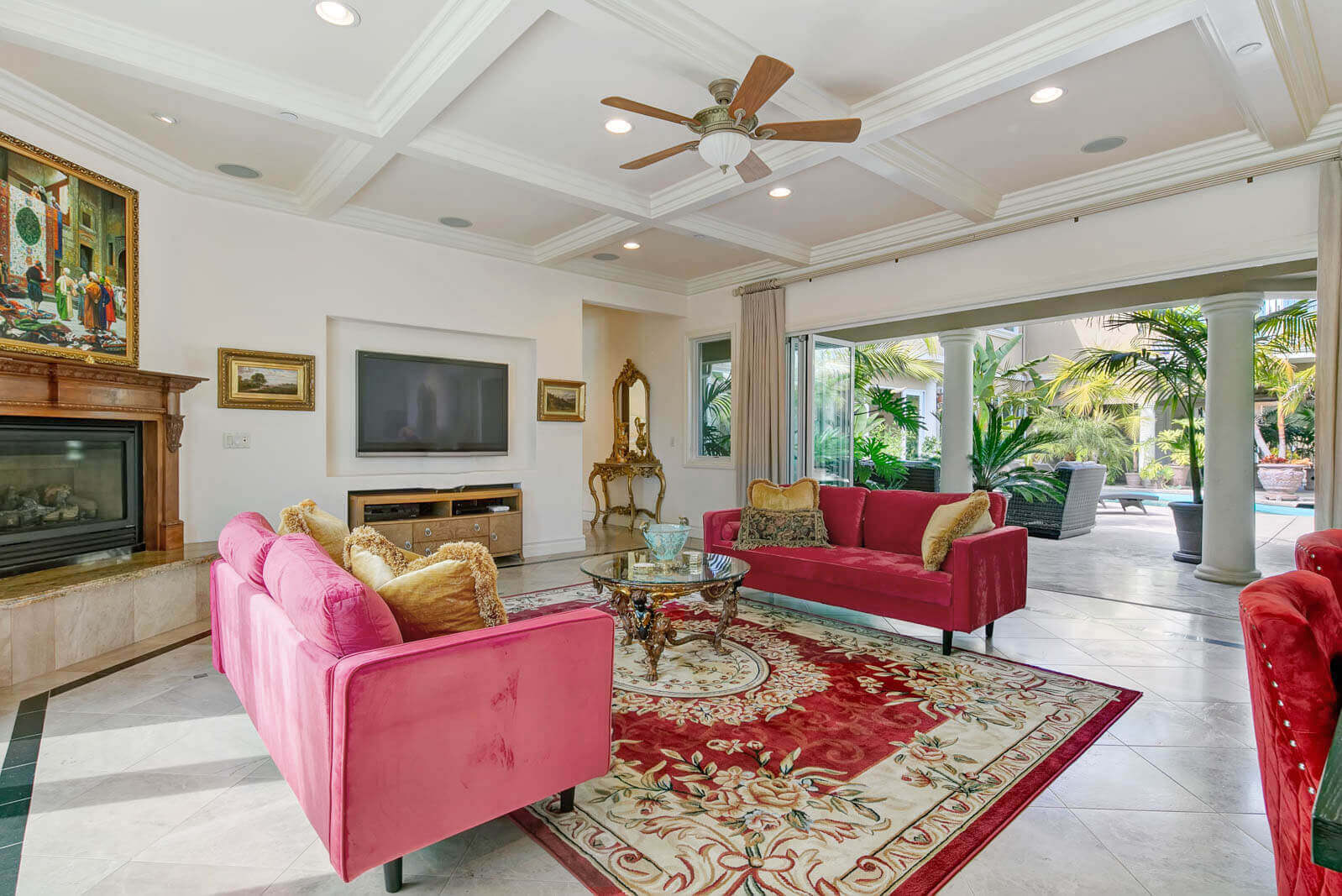The spacious family room features beautiful coffered ceilings, marble floors and a gas fireplace. It is open to the kitchen and can also accommodate a large dining table. A nano door on one side completely opens the wall between the family room and the central courtyard creating a seamless transition between indoor and outdoor living. Sliding doors on the other side open out to another large entertaining patio and level lawn area.