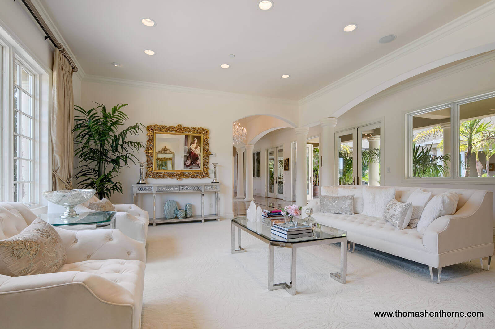 Custom double-entry doors open to welcome guests into the home’s impressive grand foyer. The arched entry is flanked by beautiful architectural columns and boasts high ceilings, crown moulding, gleaming marble floors and one of many sparkling chandeliers which hang in this luxurious residence.