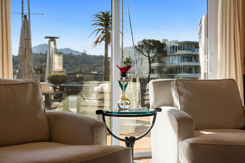 The spacious primary suite is a peaceful retreat, featuring a gas fireplace and a comfortable lounge area framed by water views and a calm, understated aesthetic. Built-in cabinetry, oak hardwood floors and a large walk-in closet add both function and a tailored finish. Walls of glass open to an inviting terrace with captivating views of the water, Mount Tamalpais, and memorable sunsets. The remodeled primary bath offers a custom vanity, walk-in shower with custom glass surround, bidet toilet and a soaking tub for a truly spa-like experience. A dedicated split-system air conditioner serves the primary suite for personalized comfort.