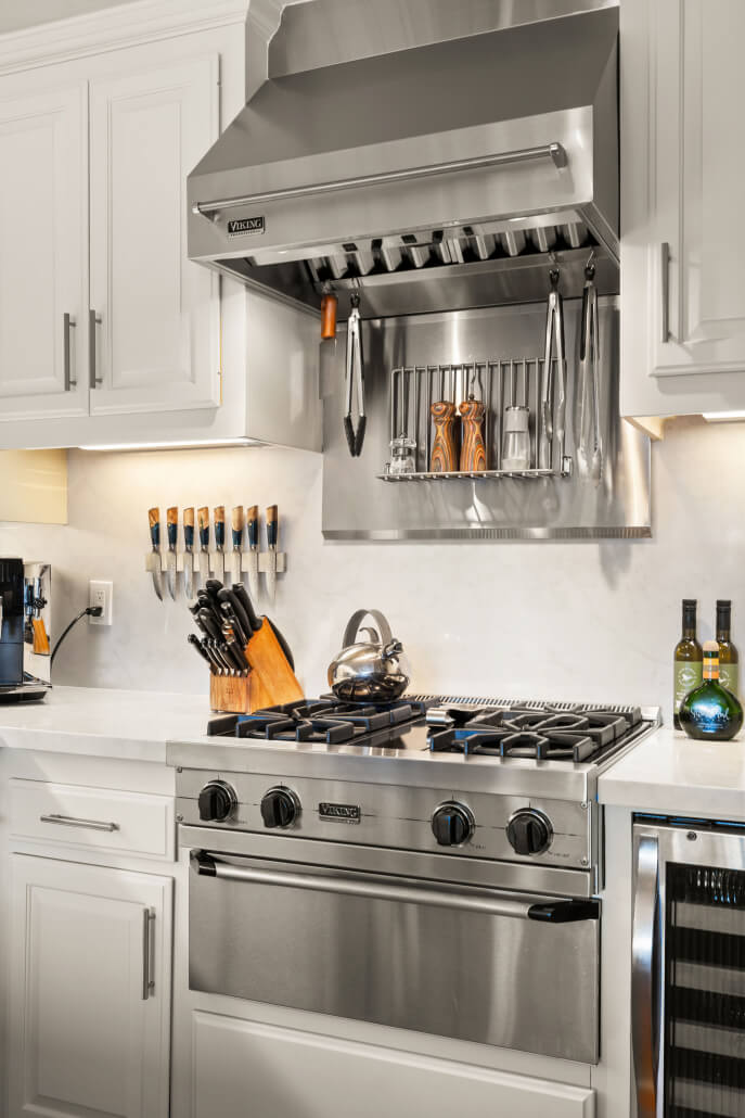Designed for both daily living and entertaining, the kitchen features new quartz countertops and backsplashes, newly-painted cabinetry, updated hardware and teak parquet floors. The suite of high-end stainless appliances includes a Viking cooktop with a warming drawer, a Viking wine fridge, Monogram double ovens, a Bosch dishwasher, and a built-in KitchenAid refrigerator.