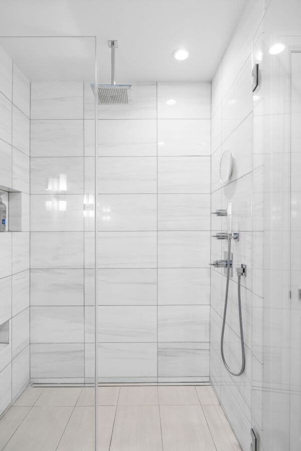 The second bedroom is well proportioned and thoughtfully positioned, with convenient access to the updated second bathroom. Ideal for guests or family, it maintains the home’s consistent sense of light, privacy, and comfort. The remodeled guest bath features a custom vanity with artisan tile work, a heated towel rack, bidet toilet and a large walk-in shower with a sleek glass surround.