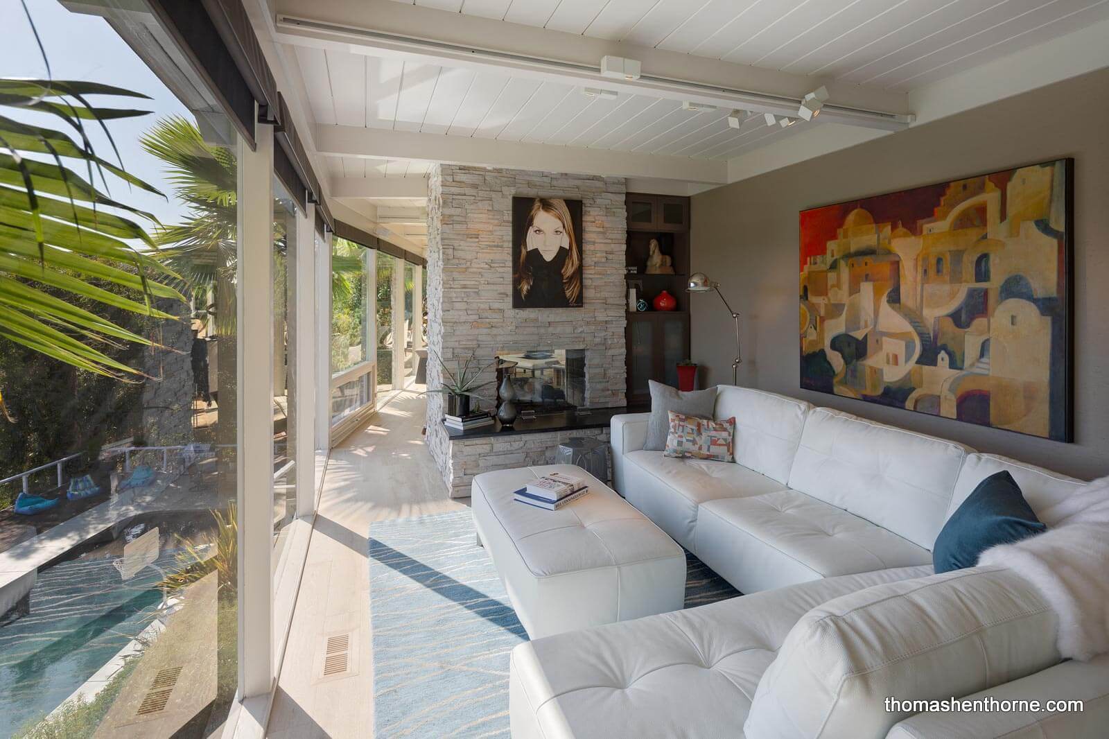 The first family room is open to the beautifully remodeled kitchen and features floor-to-ceiling walls of glass looking out to the swimming pool below and the panoramic views of Mt. Tamalpais to the west. Open-beam ceilings and a two-sided see-through stacked stone fireplace add to the design appeal of the space. The mountain is beautifully framed through every window.