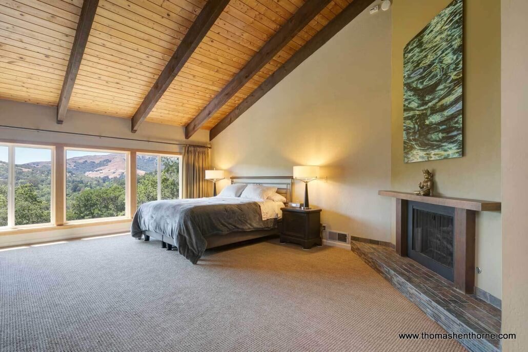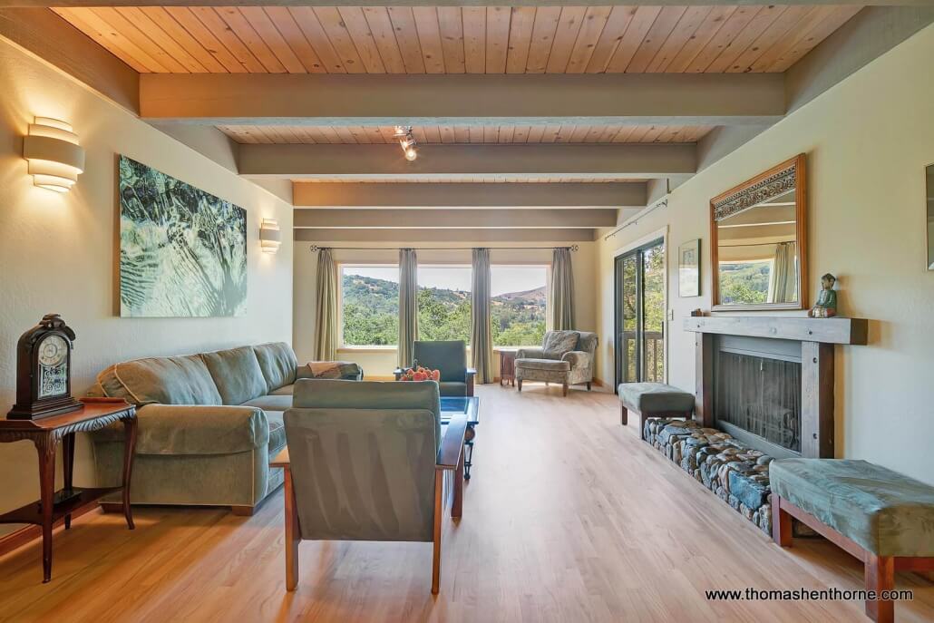 The gracious living room adjoins the kitchen/dining room on the main level and features newly refinished oak floors, an open beam ceiling, a custom designed gas-assist fireplace and of course, incredible panoramic views.