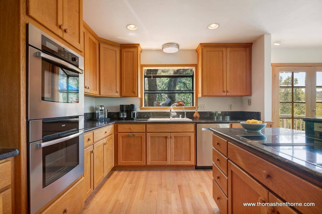 The kitchen is open to the dining room and both flow out to an inviting view deck perfect for watching the sunset and dining al fresco. The kitchen features custom-built black oak cabinetry, dual sinks, double ovens, granite countertops, a convenient pantry, a new Bosch dishwasher and panoramic views.