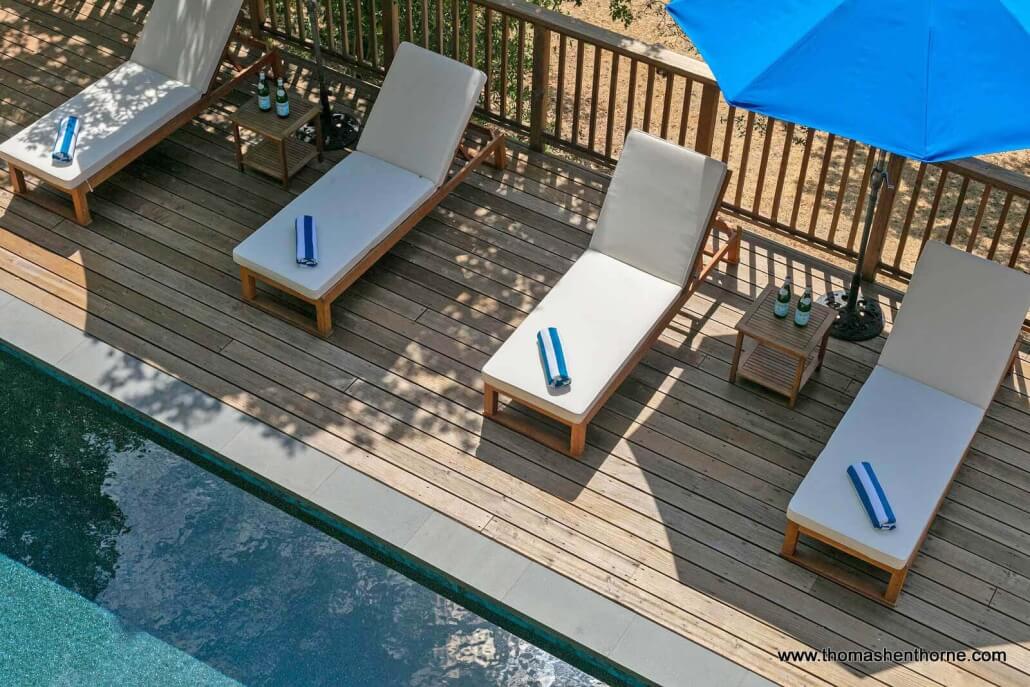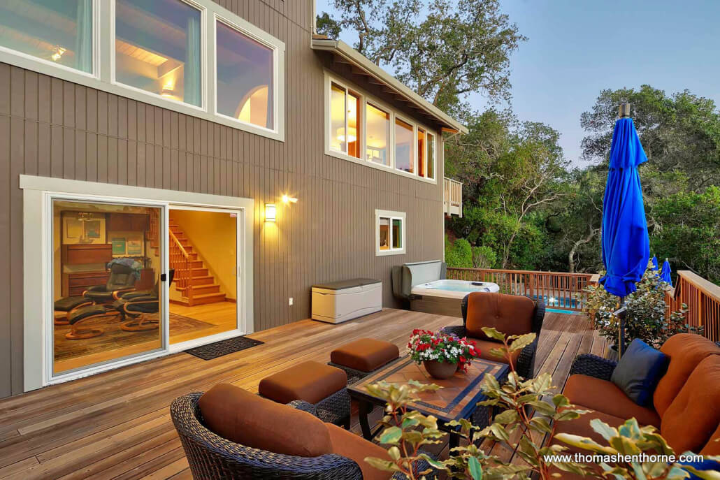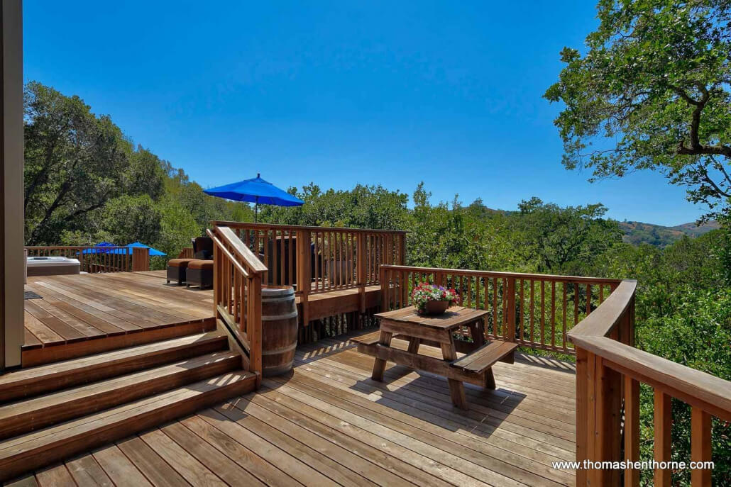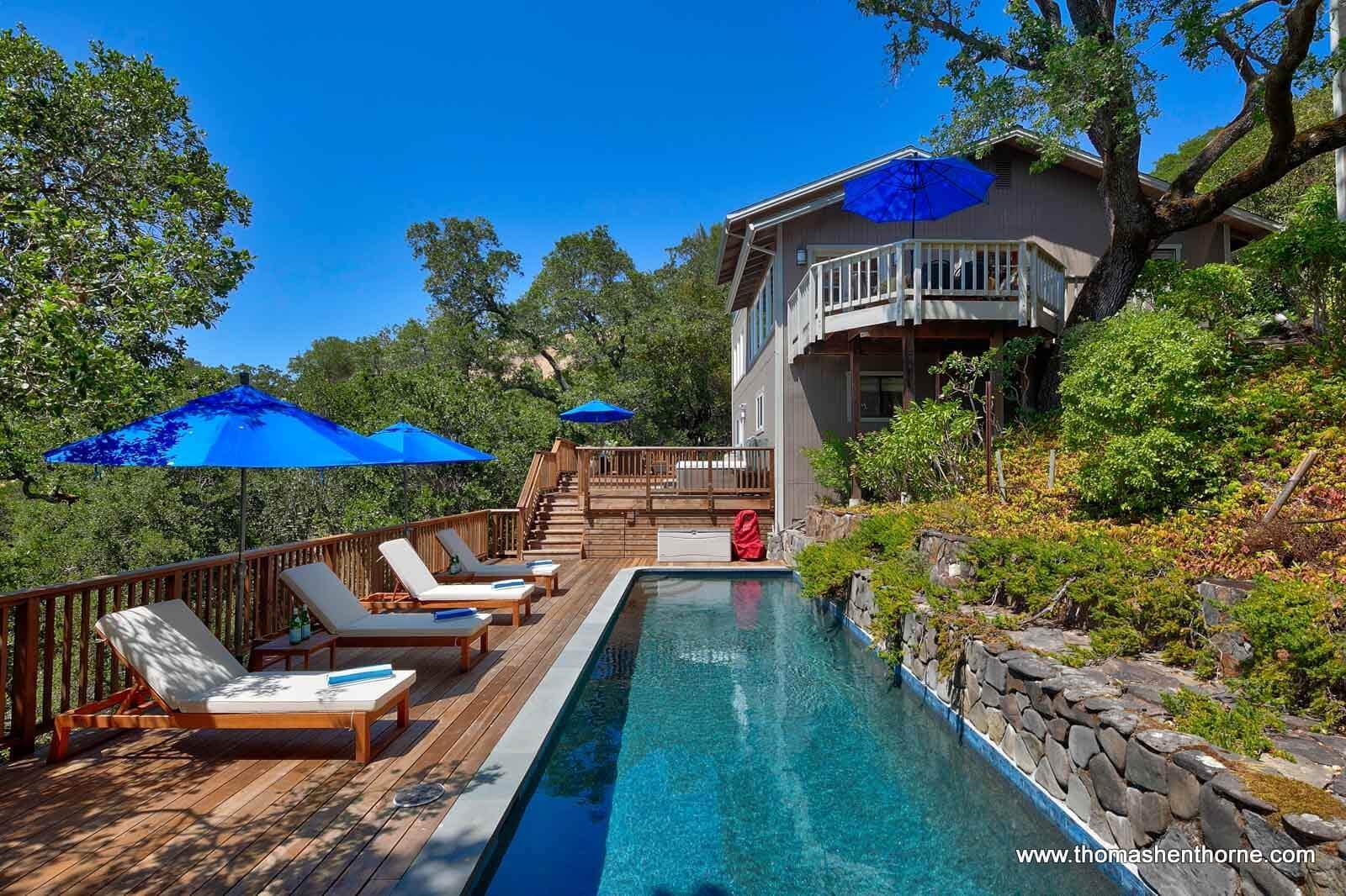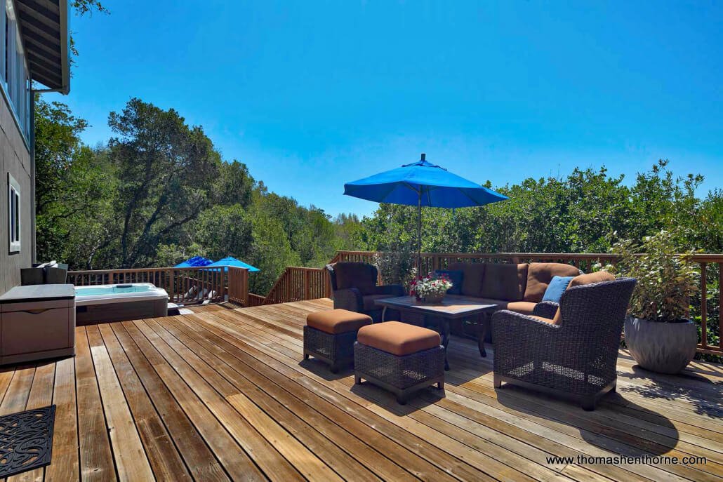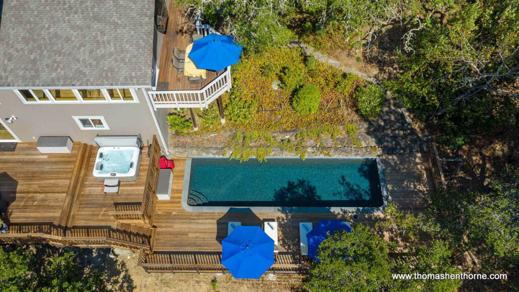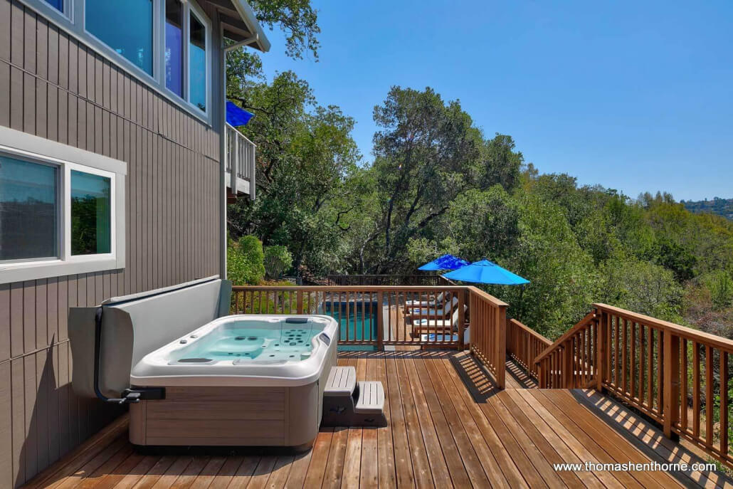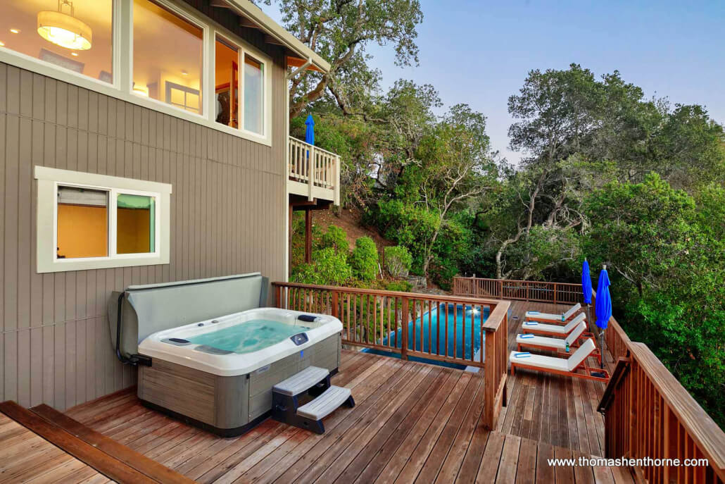 The inviting swimming pool at 390 Fawn Drive was recently resurfaced and is worthy of a boutique resort. The pool enjoys privacy, views and receives full sun most of the day. It is surrounded by a large redwood deck ideal lounging and entertaining poolside. There is also a jetted spa perfect for watching the sunset and stargazing at night.