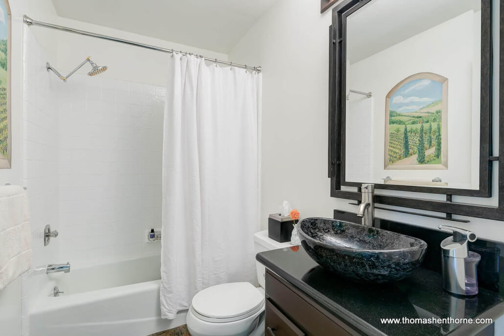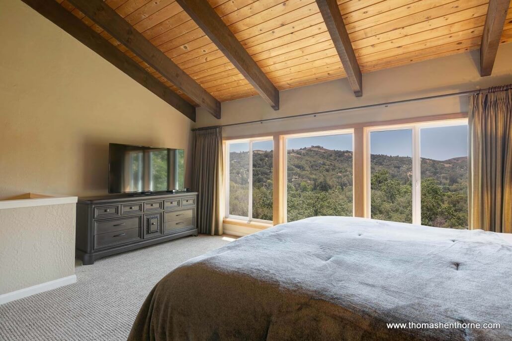 The second primary suite is located upstairs and features a dramatic wall of windows that look out to the panoramic views and vineyard below, open-beam vaulted ceilings, a gas-assist fireplace, large walk-in closet and an ensuite bathroom with a custom-tile shower and dual sink vanity.