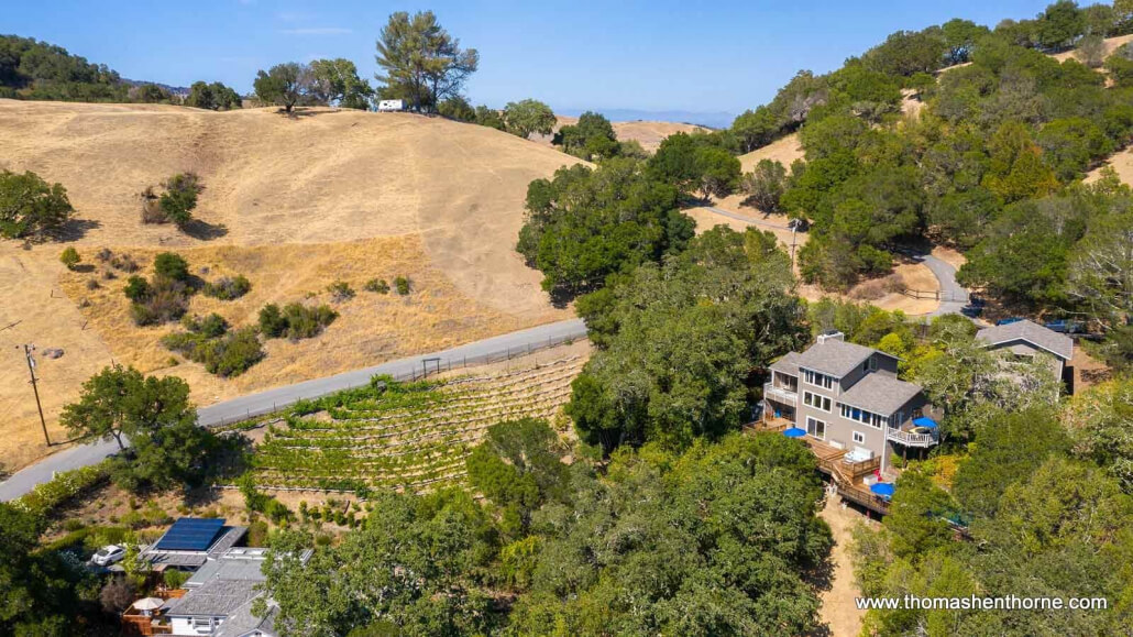 390 Fawn Drive, San Anselmo — Situated on highly-coveted Fawn Drive in San Anselmo, this spectacular 4 BR/3BA estate offers unique wine-country living in Marin County. Situated on approximately one acre of land, the home features an award-winning vineyard, a spectacular private pool worthy of a boutique resort, panoramic views, an open-concept kitchen with granite counters and black oak custom cabinetry, two family rooms and two primary suites. There are also multiple outdoor entertaining areas.