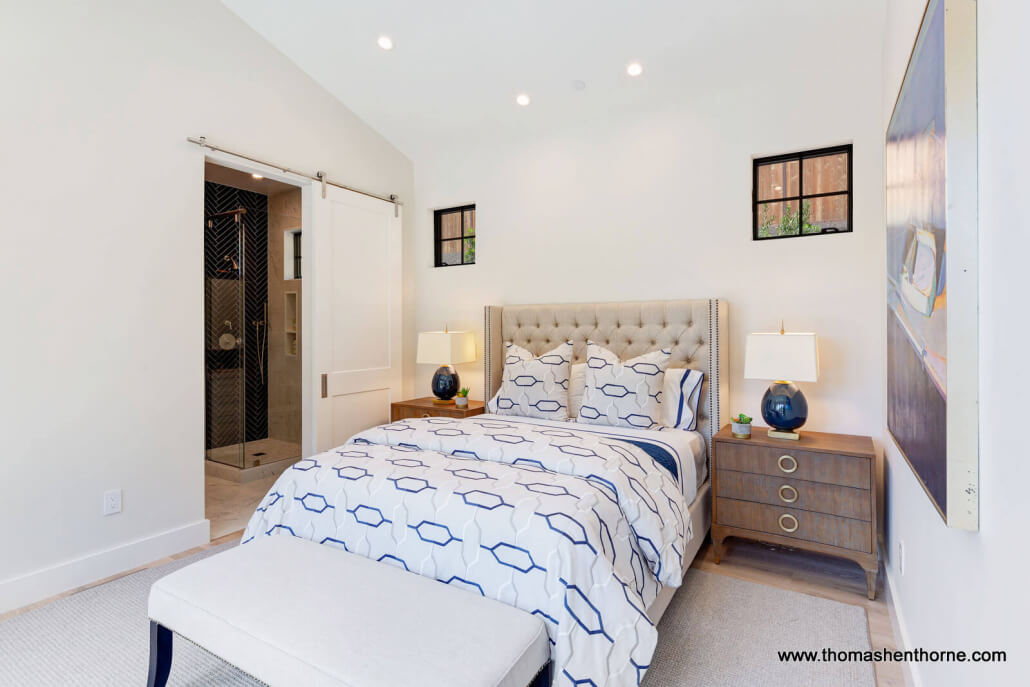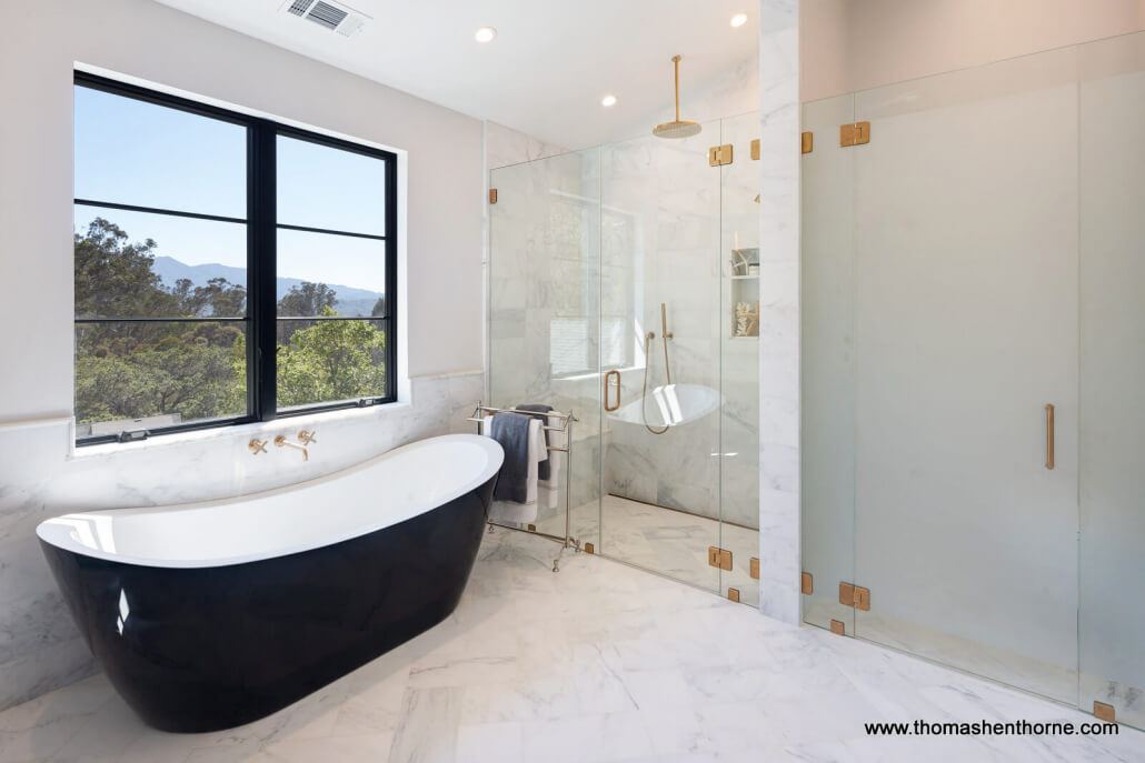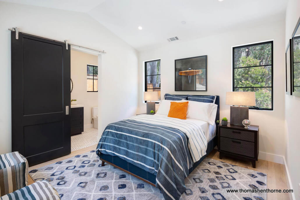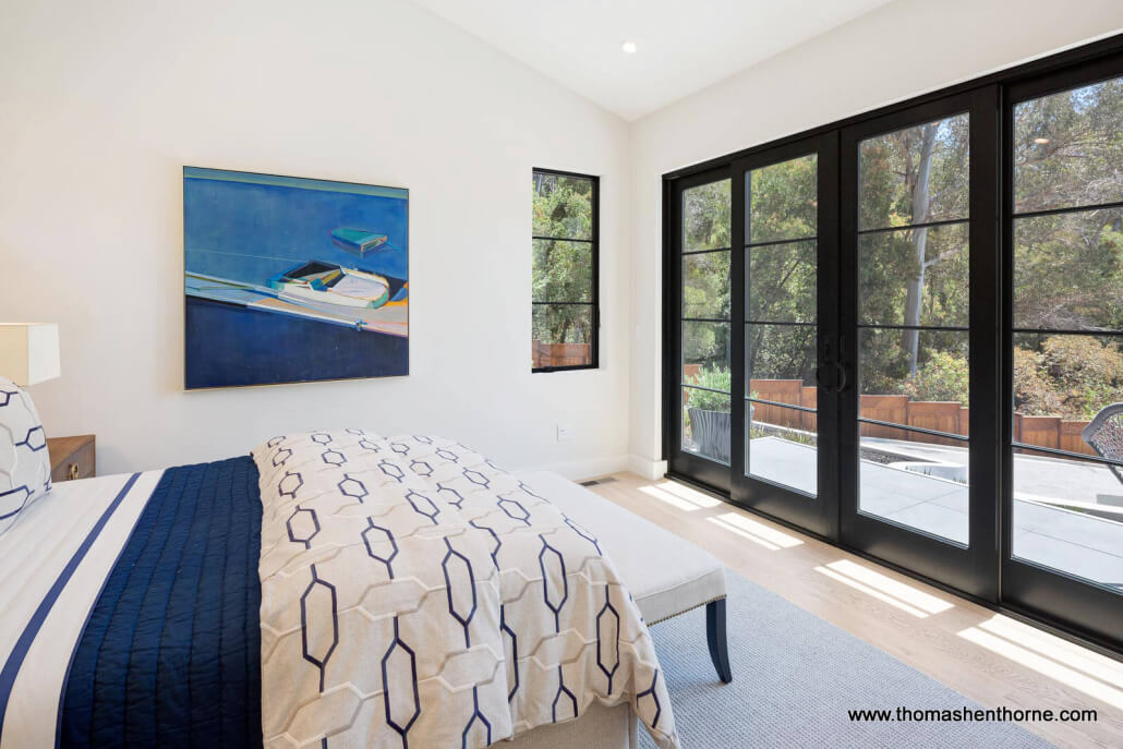 Three bedrooms are located on the upper level and all feature custom en-suite bathrooms. The master suite retreat overlooks the swimming pool and boasts panoramic Mt. Tam views, high ceilings and an enormous walk-in closet. The spa-like master bath is worthy of a 6-Star boutique resort featuring a custom black soaking tub, Carrara marble floors and walls, floating vanity with dual sinks and an integrated Carrara marble counter, large walk-in shower with glass surround and a frosted glass enclosed toilet room.