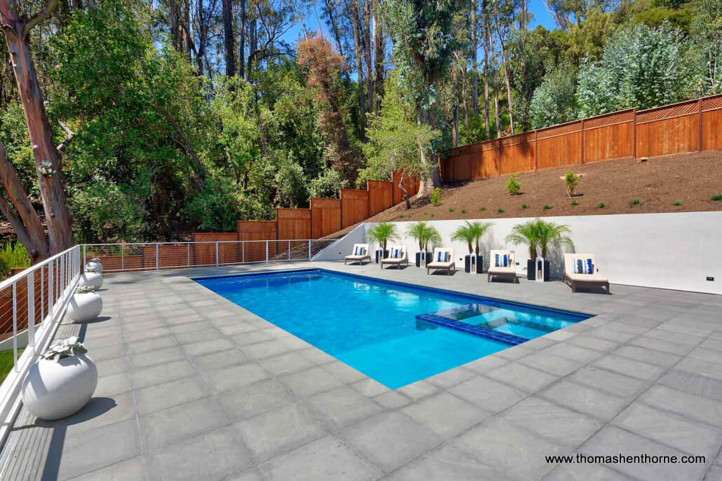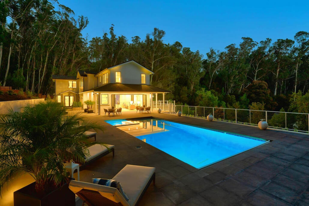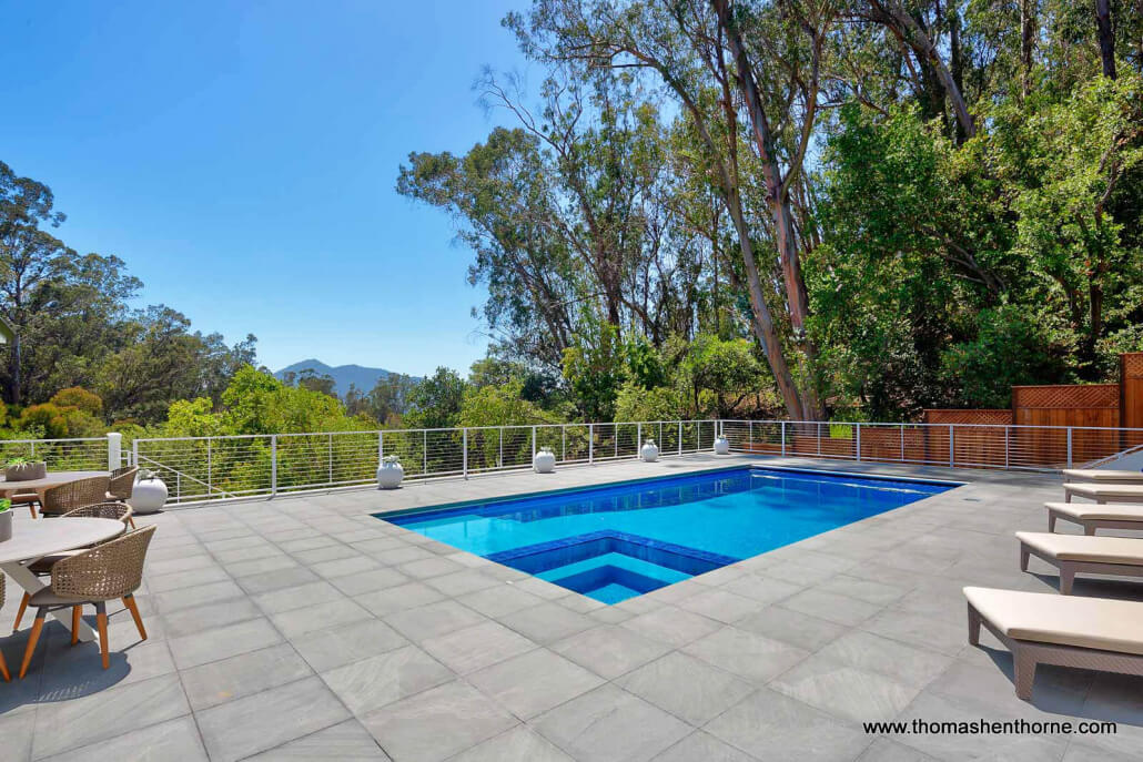 The sparkling pool enjoys full sun for most of the day. A wall of glass from the kitchen/family rooms slides open to create the perfect flow between the indoor and outdoor spaces. A true show-stopper, this spectacular pool is surrounded by a large bluestone patio with stunning views of Mt. Tamalpais. There is even a full bath accessed from outside and custom-designed for the pool. No detail has been overlooked in creating an easy, luxurious resort lifestyle.