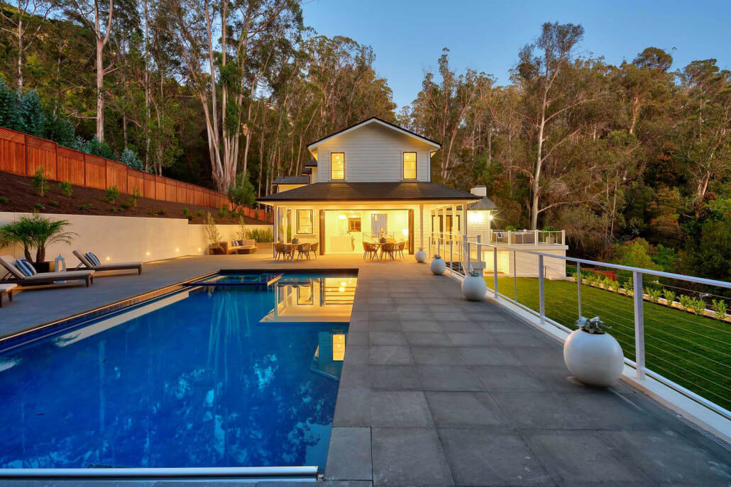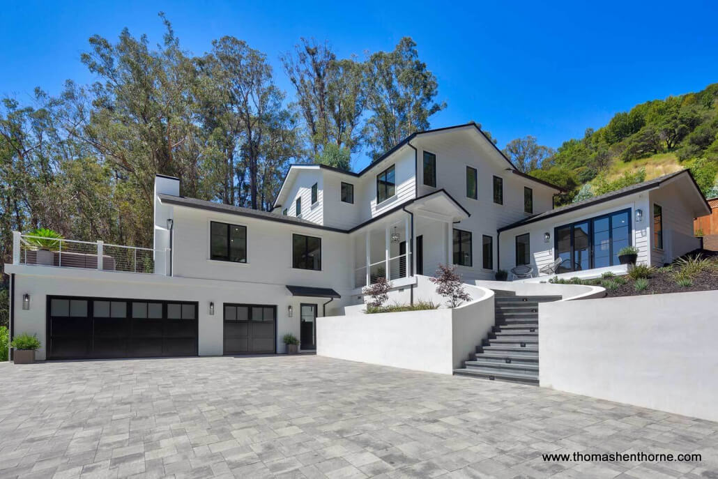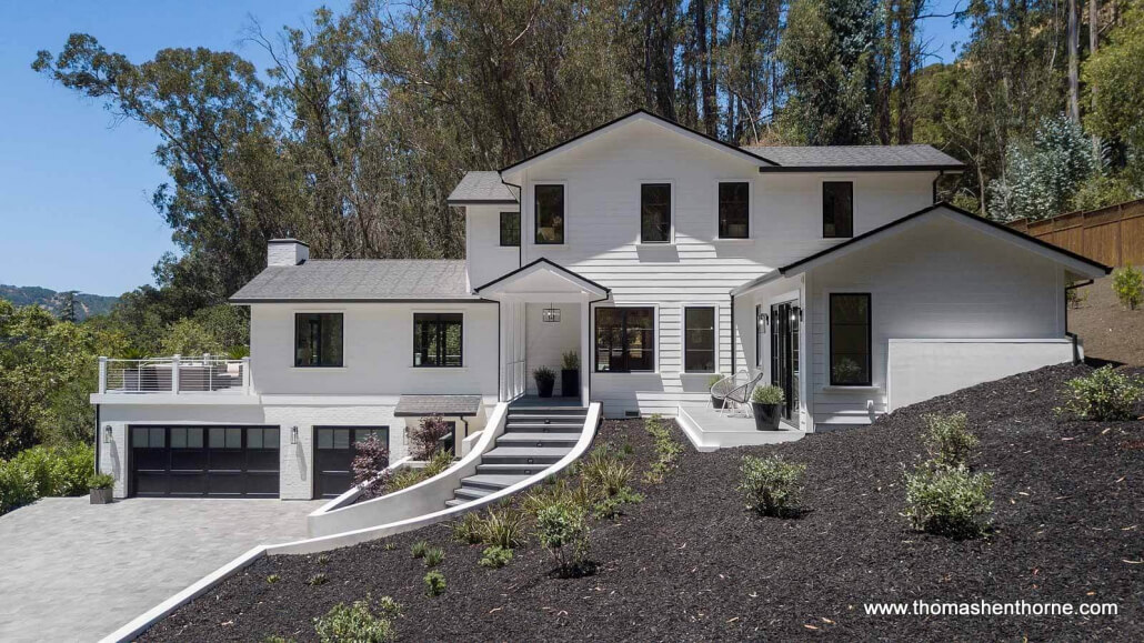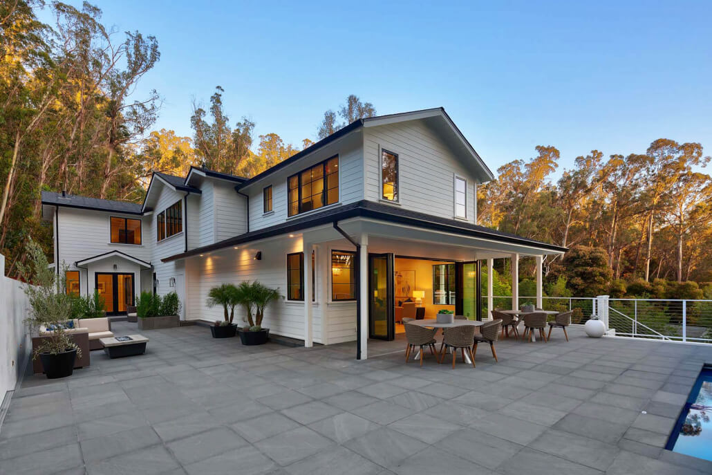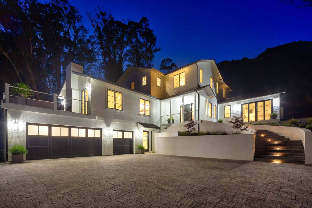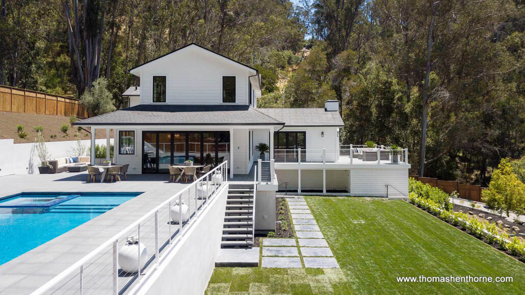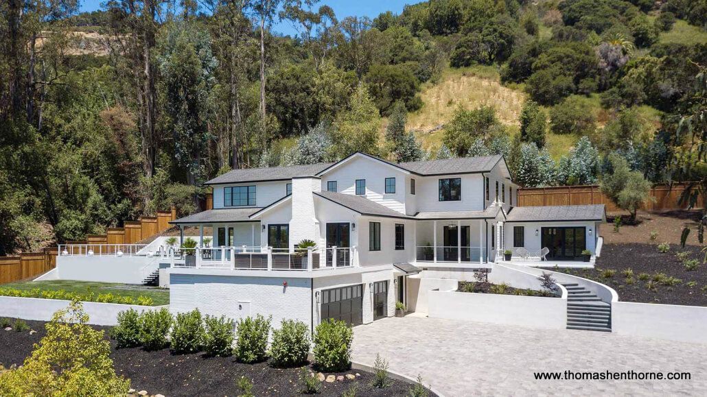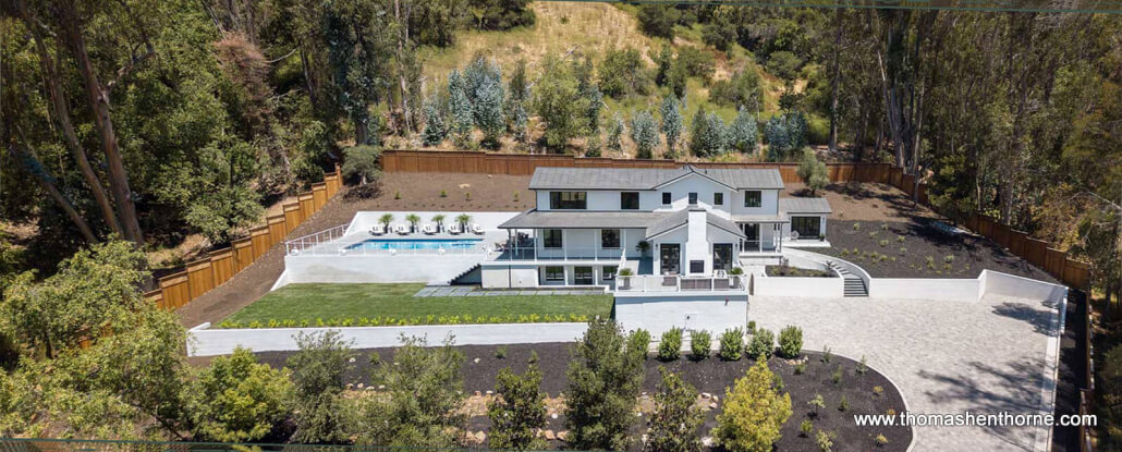 61 Gold Hill Grade, San Rafael — Situated behind custom gates at the end of Gold Hill Grade in the exclusive Dominican neighborhood of San Rafael, this newly-constructed 4 BR+office / 6.5 BA modern farmhouse masterpiece has it all – an open-concept floor plan, sparkling blue swimming pool off the main living level, expansive level lawn, panoramic Mt. Tam views, exquisite privacy and premium design and finishes throughout. No detail has been overlooked in making this estate a home that will be enjoyed for generations to come.